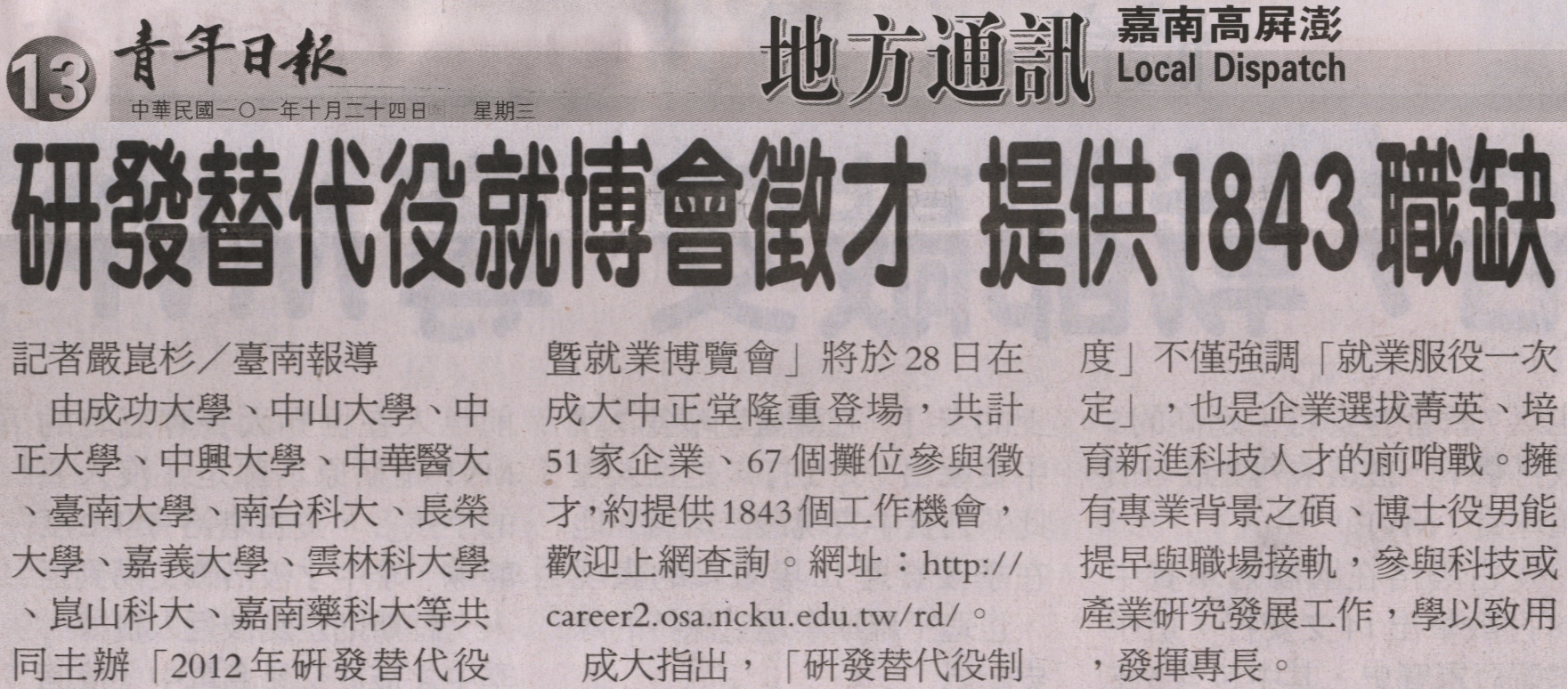 由成功大學、中山大學、中正大學、中興大學、中華醫大、臺南大學、南台科大、長榮大學、嘉義大學、雲林科大學、崑山科大、嘉南藥科大等共同主辦「2012年研發替代役暨就業博覽會」將於28日在成大中正堂隆重登場,共計51家企業、67個攤位參與徵才,約提供1843個工作機會,歡迎上網查詢。網址:http://career2.osa.ncku.edu.tw/rd/。