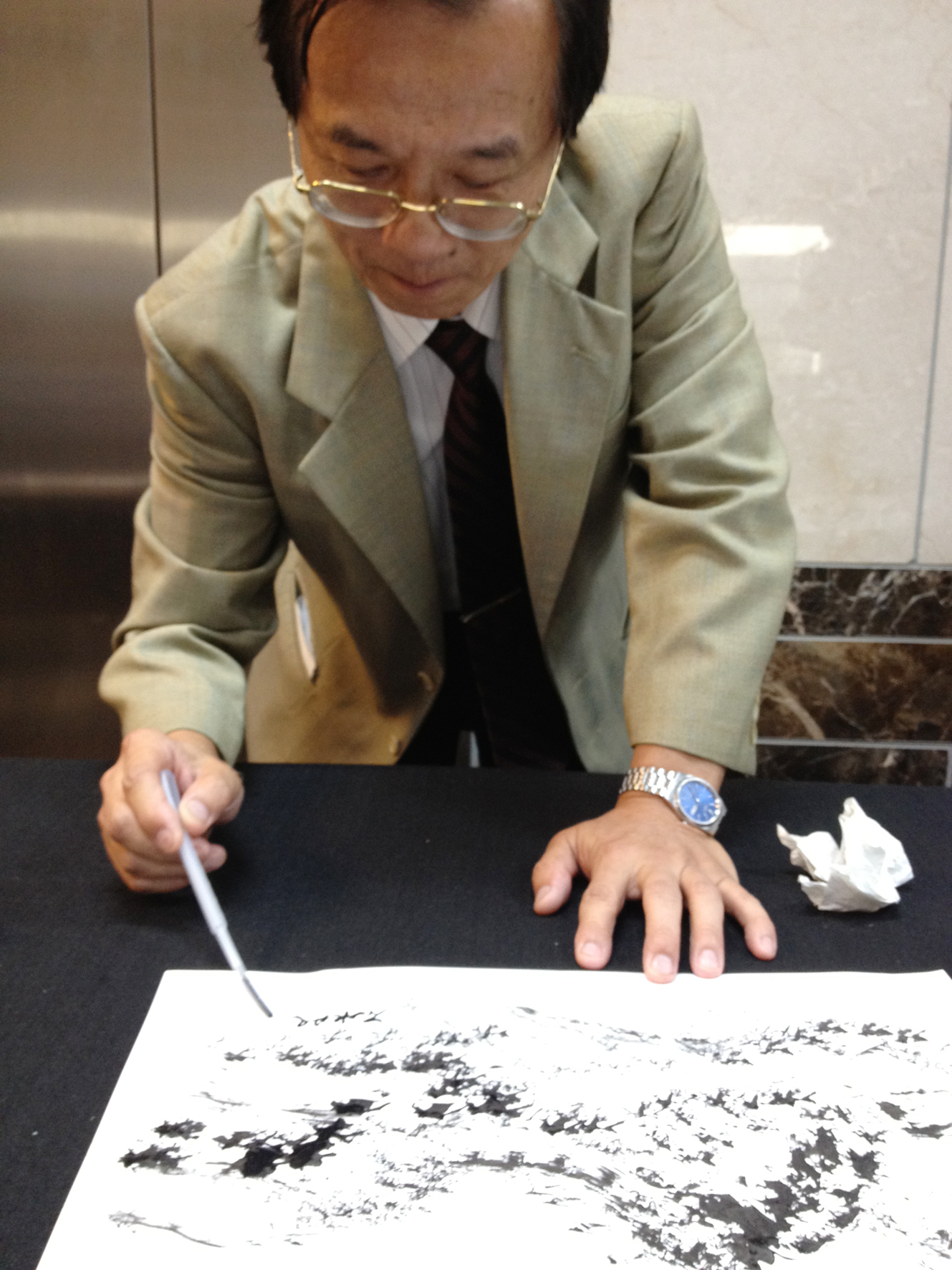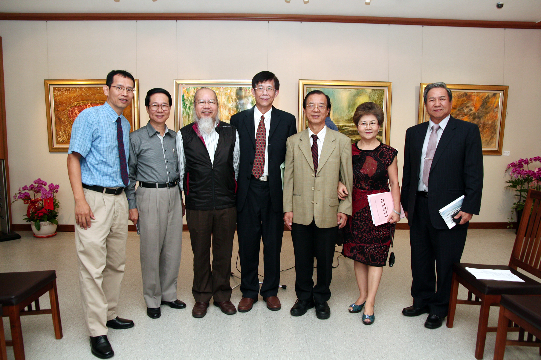 ![]() 此次展覽中,楊秋忠老師最喜歡的作品之一,全幅未用任何繪圖媒材,只靠顏材在紙上渲染,呈現自然豐富的層次 ![]() 徐堯煇副校長(中)、楊秋忠老師賢伉儷(左2-3)與興大藝術中心前後任主任陳欽忠老師(左2)、李順興主任(左1)等貴賓出席開幕茶會 |
