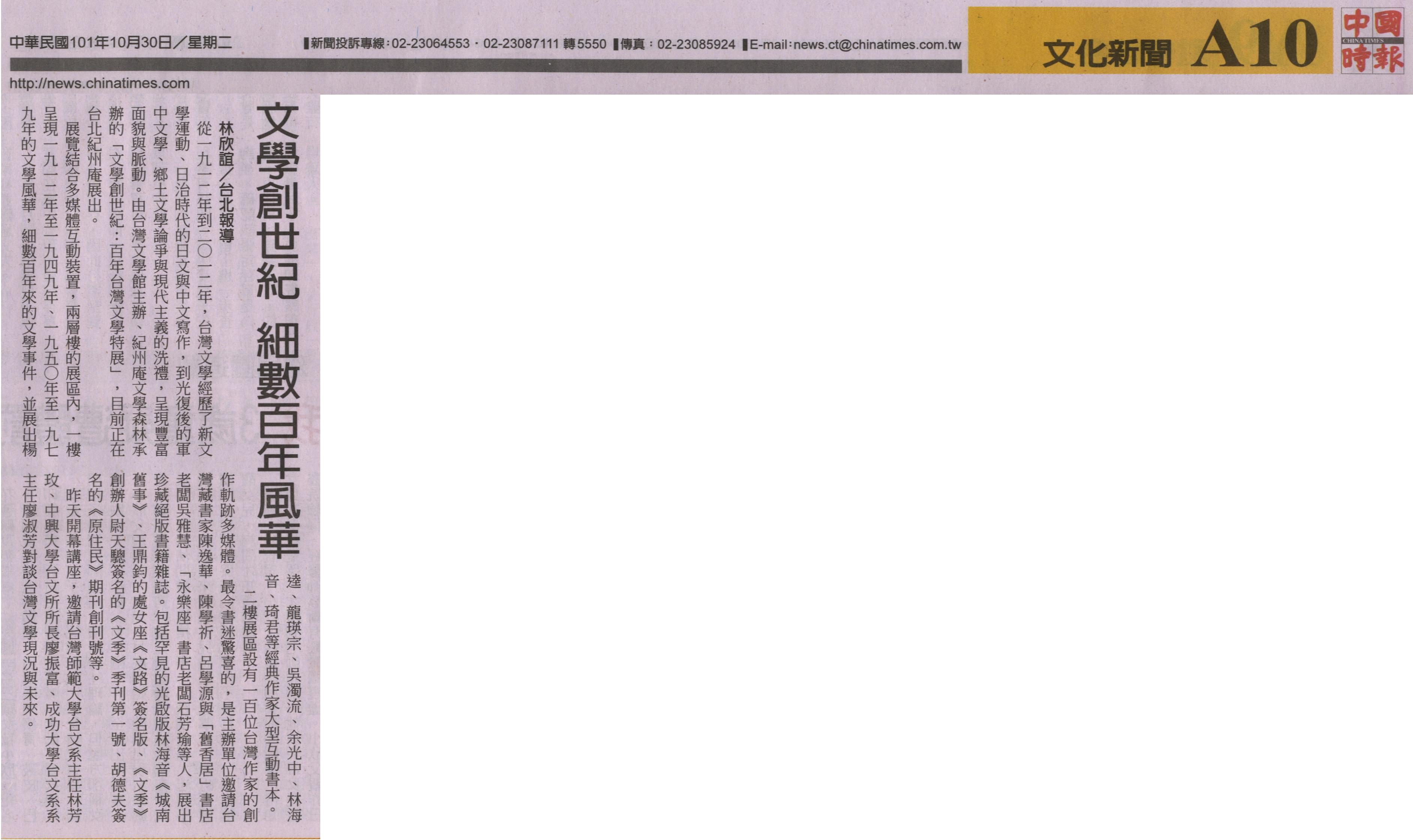 從一九一二年到二○一二年,台灣文學經歷了新文學運動、日治時代的日文與中文寫作,到光復後的軍中文學、鄉土文學論爭與現代主義的洗禮,呈現豐富面貌與脈動。由台灣文學館主辦、紀州庵文學森林承辦的「文學創世紀:百年台灣文學特展」,目前正在台北紀州庵展出。