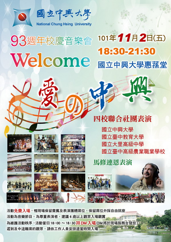 國立中興大學11月2日晚間6時30分將在惠蓀堂舉辦「93週年校慶音樂會」,邀集中興大學、台中教育大學、國立大里高中與台中高農四校近13個音樂性社團連番上台,並邀請國際知名環保音樂家馬修連恩帶來多首精彩曲目。音樂會憑活動DM免費入場,不須索票,DM將於2日晚間6點起在惠蓀堂外發送,歡迎有興趣民眾共襄盛舉。