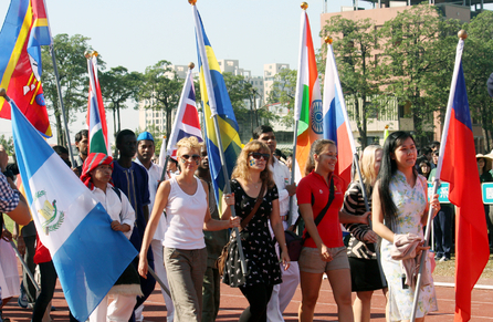 興大93週年校慶 外籍生手持自己國家的國旗參加繞場 |