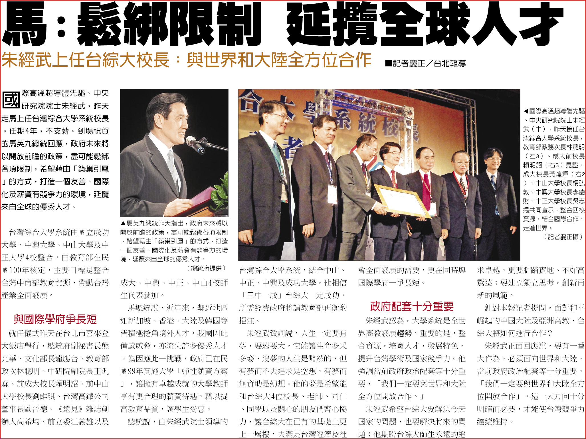 國際高溫超導體先驅、中央研究院院士朱經武,昨天走馬上任台灣綜合大學系統校長,任期4年,不支薪。到場祝賀的馬英九總統回應,政府未來將以開放前瞻的政策,盡可能鬆綁各項限制,希望藉由「築巢引鳳」的方式,打造一個友善、國際化及薪資有競爭力的環境,延攬來自全球的優秀人才。