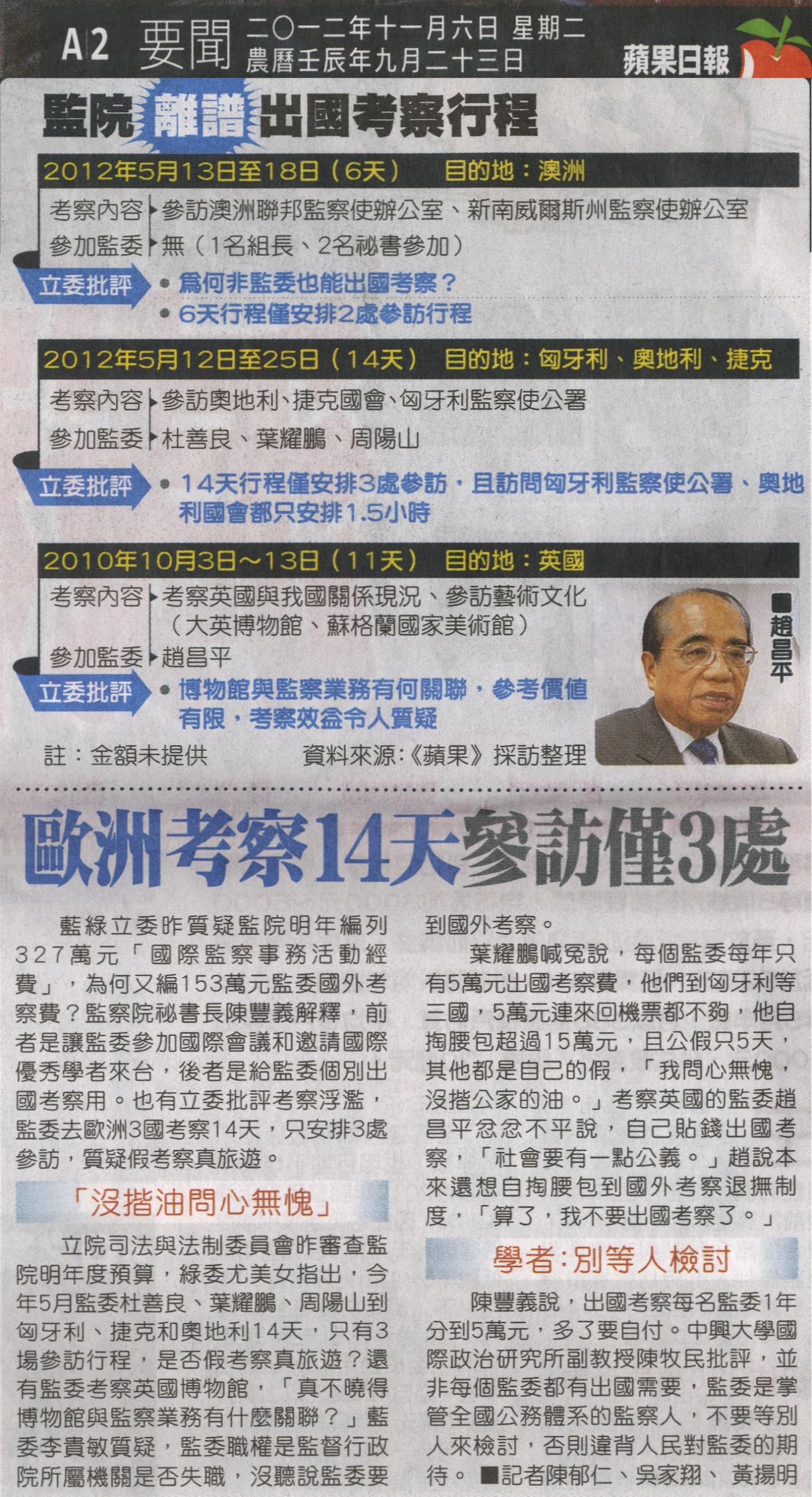 葉耀鵬喊冤說,每個監委每年只有5萬元出國考察費,他們到匈牙利等三國,5萬元連來回機票都不夠,他自掏腰包超過15萬元,且公假只5天,其他都是自己的假,「我問心無愧,沒揩公家的油。」考察英國的監委趙昌平忿忿不平說,自己貼錢出國考察,「社會要有一點公義。」趙說本來還想自掏腰包到國外考察退撫制度,「算了,我不要出國考察了。」