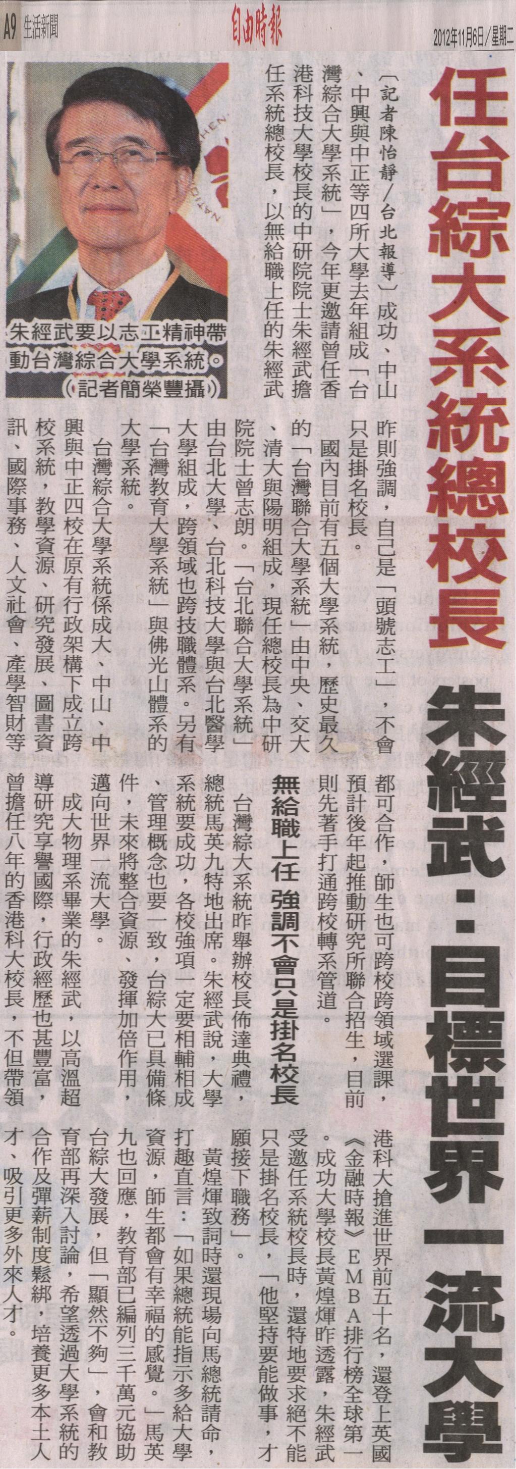 校長朱經武表示,他回台是當「頭號志工」,不是只想要掛名校長而已,而是要能做點事,才願接下職務。他希望未來能夠向政府與企業爭取更多資源,也期許未來台綜大能帶動台灣全面發展,躋身世界一流大學。