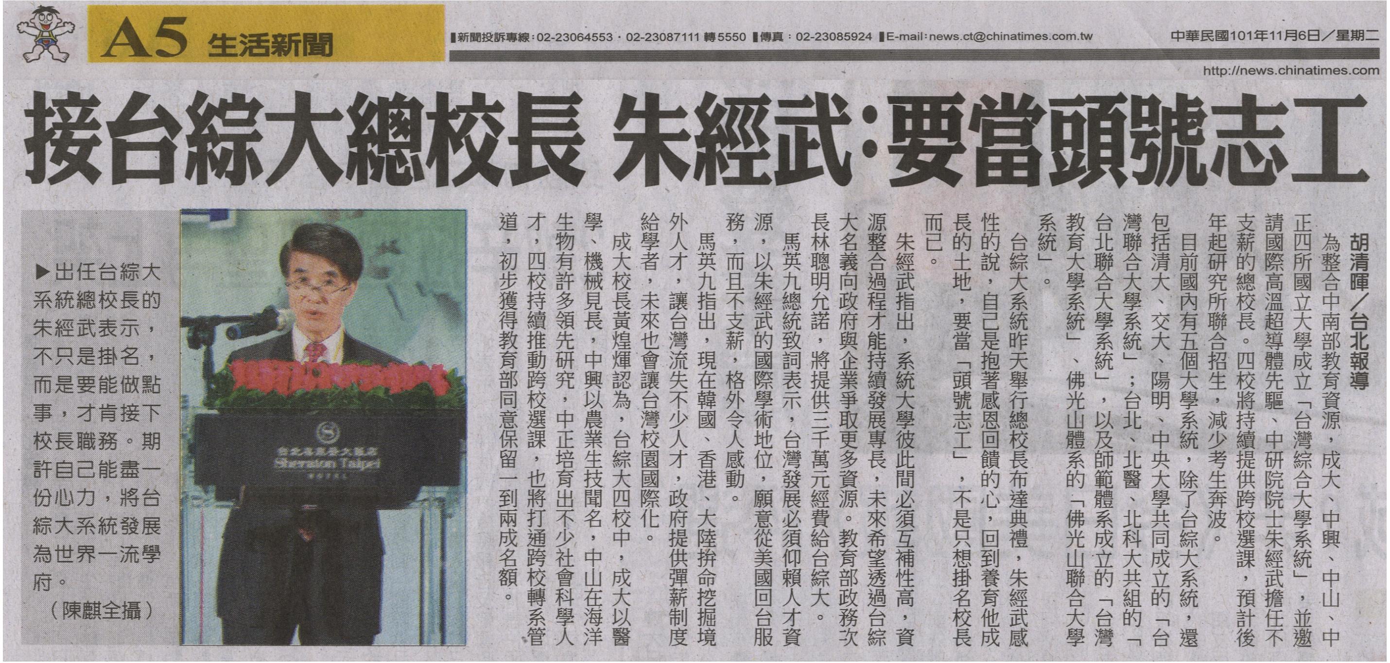 為整合中南部教育資源,成大、中興、中山、中正四所國立大學成立「台灣綜合大學系統」,並邀請國際高溫超導體先驅、中研院院士朱經武擔任不支薪的總校長。四校將持續提供跨校選課,預計後年起研究所聯合招生,減少考生奔波。