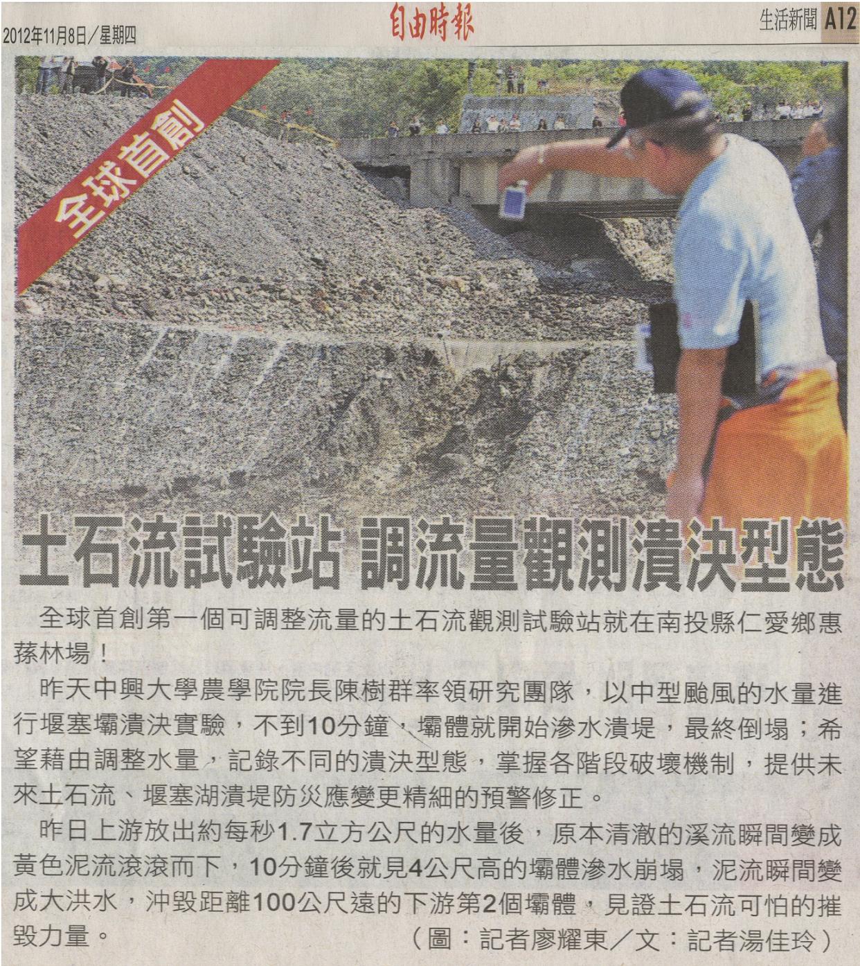 昨天中興大學農學院院長陳樹群率領研究團隊,以中型颱風的水量進行堰塞壩潰決實驗,不到10分鐘,壩體就開始滲水潰堤,最終倒塌;希望藉由調整水量,記錄不同的潰決型態,掌握各階段破壞機制,提供未來土石流、堰塞湖潰堤防災應變更精細的預警修正。