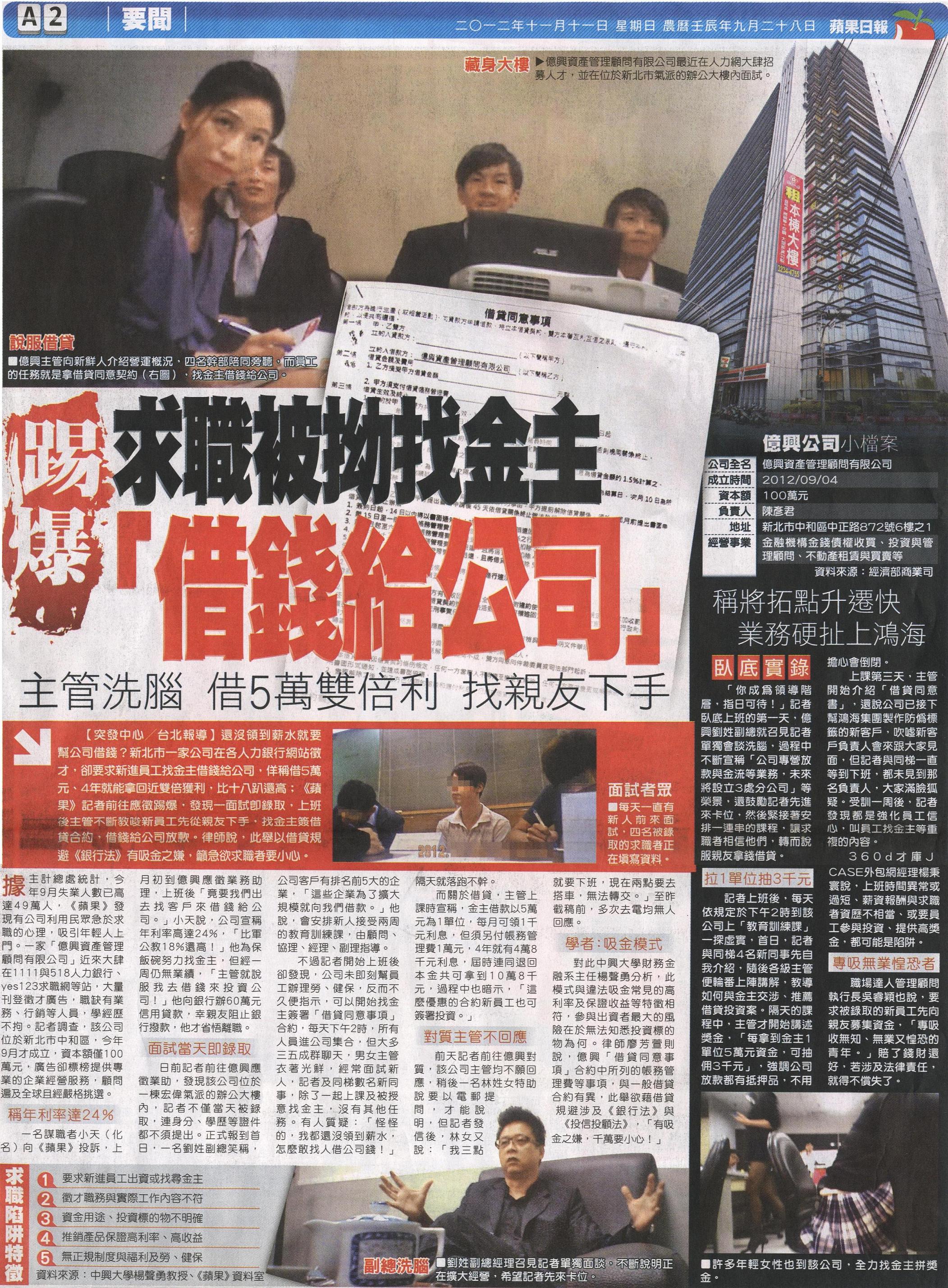 稱年利率達24% 一名謀職者小天(化名)向《蘋果》投訴,上月初到億興應徵業務助理,上班後「竟要我們出去找客戶來借錢給公司。」小天說,公司宣稱年利率高達24%,「比軍公教18%還高!」他為保飯碗努力找金主,但經一周仍無業績,「主管就說服我去借錢來投資公司!」他向銀行辦60萬元信用貸款,幸親友阻止銀行撥款,他才省悟離職。