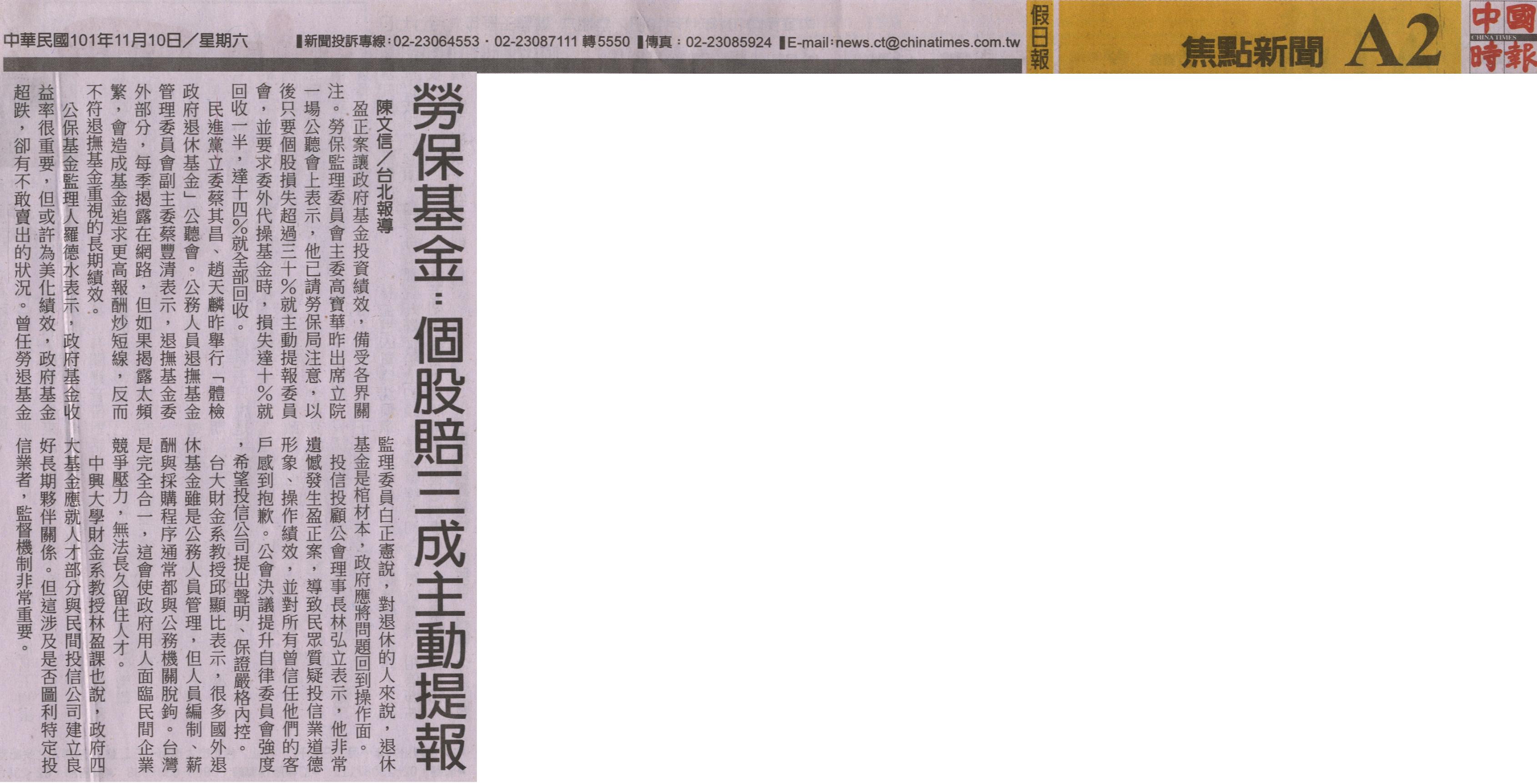 盈正案讓政府基金投資績效,備受各界關注。勞保監理委員會主委高寶華昨出席立院一場公聽會上表示,他已請勞保局注意,以後只要個股損失超過三十%就主動提報委員會,並要求委外代操基金時,損失達十%就回收一半,達十四%就全部回收。