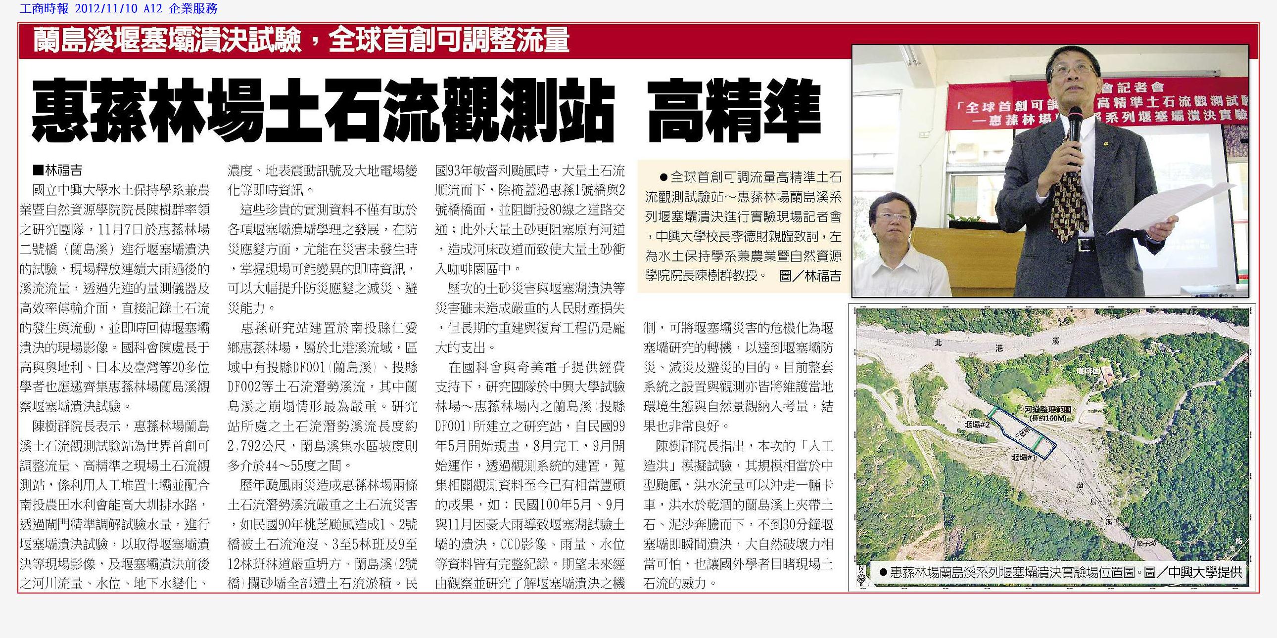 國立中興大學水土保持學系兼農業暨自然資源學院院長陳樹群率領之研究團隊,11月7日於惠蓀林場二號橋(蘭島溪)進行堰塞壩潰決的試驗,現場釋放連續大雨過後的溪流流量,透過先進的量測儀器及高效率傳輸介面,直接記錄土石流的發生與流動,並即時回傳堰塞壩潰決的現場影像。國科會陳處長于高與奧地利、日本及臺灣等20多位學者也應邀齊集惠蓀林場蘭島溪觀察堰塞壩潰決試驗。