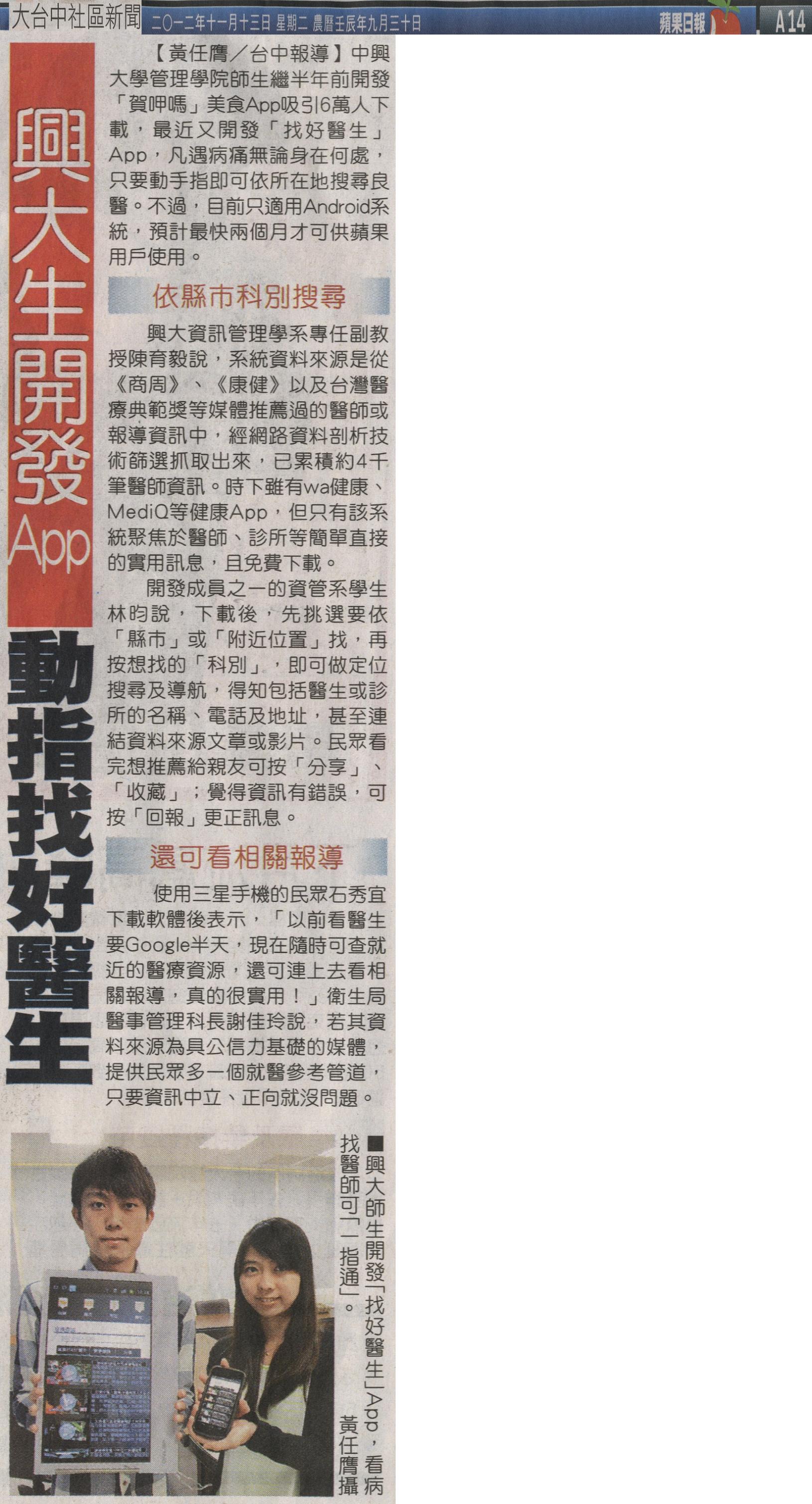 中興大學管理學院師生繼半年前開發「賀呷嗎」美食App吸引6萬人下載,最近又開發「找好醫生」App,凡遇病痛無論身在何處,只要動手指即可依所在地搜尋良醫。不過,目前只適用Android系統,預計最快兩個月才可供蘋果用戶使用。