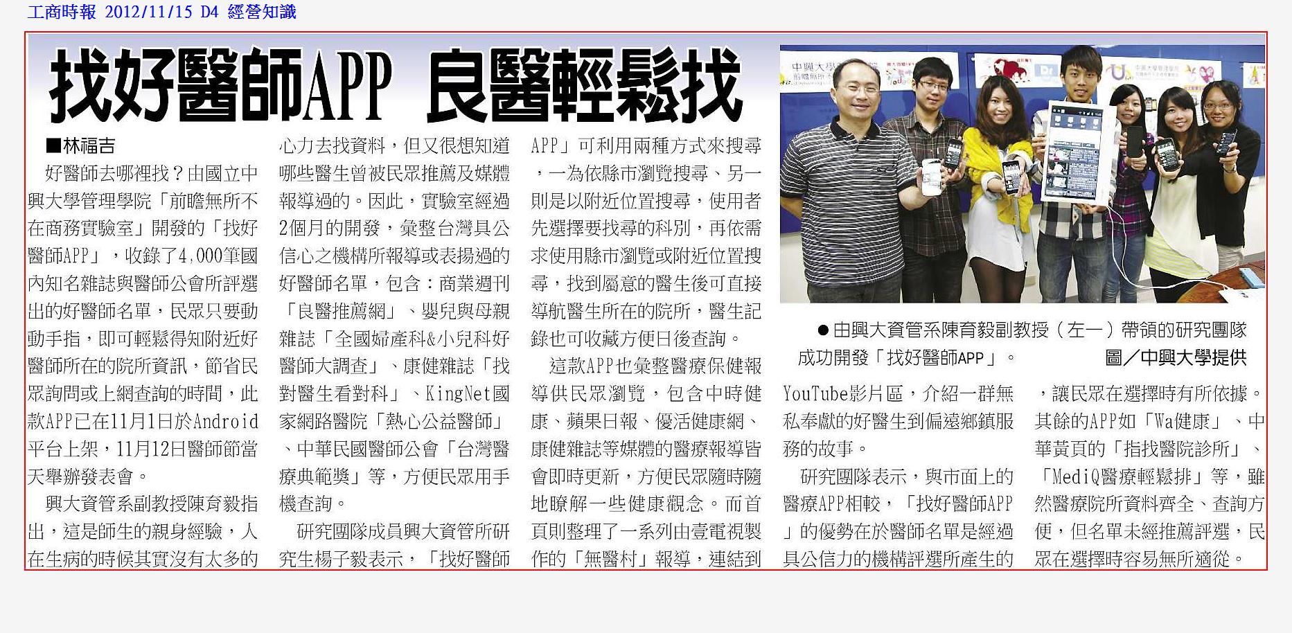 好醫師去哪裡找?由國立中興大學管理學院「前瞻無所不在商務實驗室」開發的「找好醫師APP」,收錄了4,000筆國內知名雜誌與醫師公會所評選出的好醫師名單,民眾只要動動手指,即可輕鬆得知附近好醫師所在的院所資訊,節省民眾詢問或上網查詢的時間,此款APP已在11月1日於Android平台上架,11月12日醫師節當天舉辦發表會。