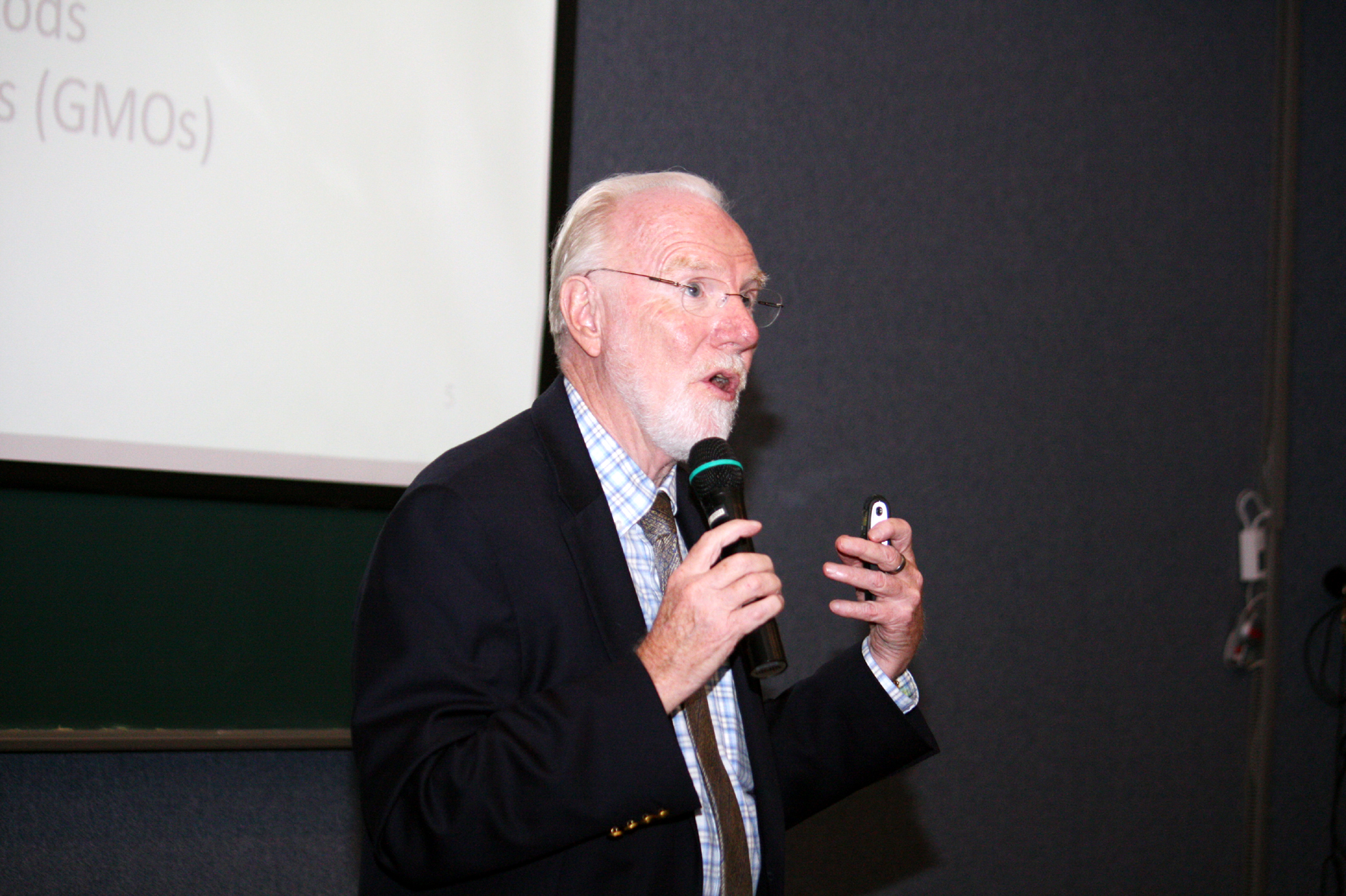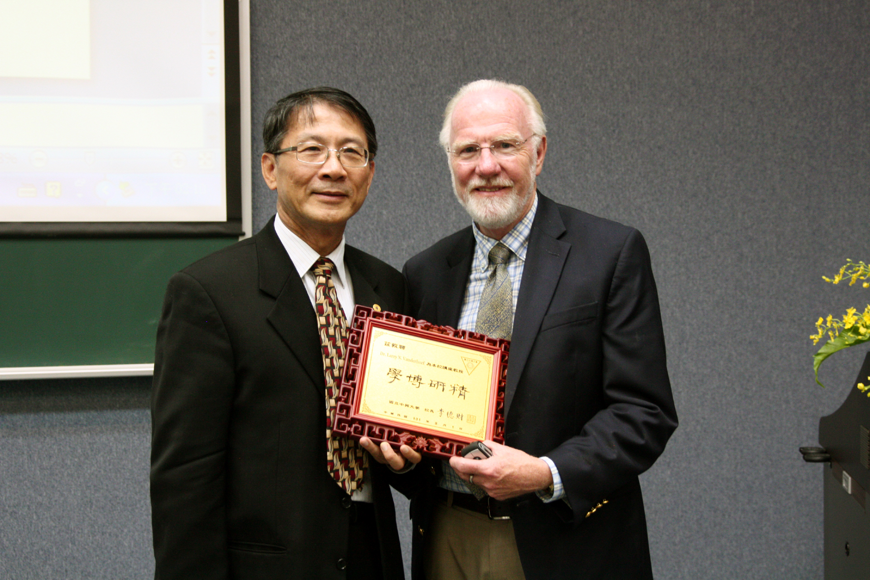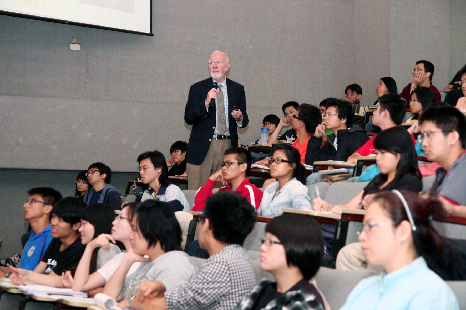 【圖文/媒體公關組】國 際級大師中興大學開講!國立中興大學今年度聘任美國加州大學戴維斯分校名譽校長 Larry N. Vanderhoef 為興大講座教授,11月6日至15日兩週期間,Vanderhoef 以「給未來總統的生物課」為題,發表四場英語演講,演講廳內一百多個座位,座無虛席,師生提問踴躍。