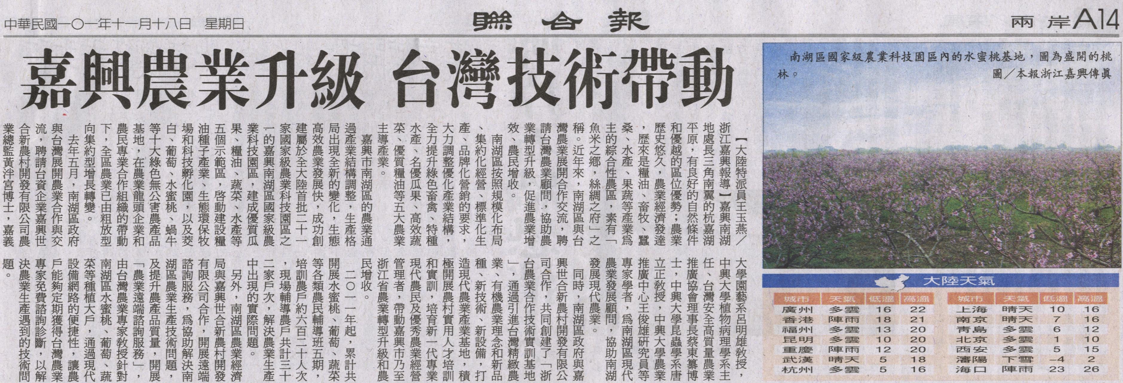 去年五月,南湖區政府與台灣展開農業合作與交流,聘請台資企業嘉興世合新農村開發有限公司農業總監黃泮宮博士,嘉義大學園藝系呂明雄教授,中興大學植物病理學系主任、台灣安全高質量農業推廣協會理事長蔡東纂博士,中興大學昆蟲學系唐立正教授,中興大學農業推廣中心王俊雄研究員等專家學者,為南湖區現代農業發展顧問,協助南湖發展現代農業。