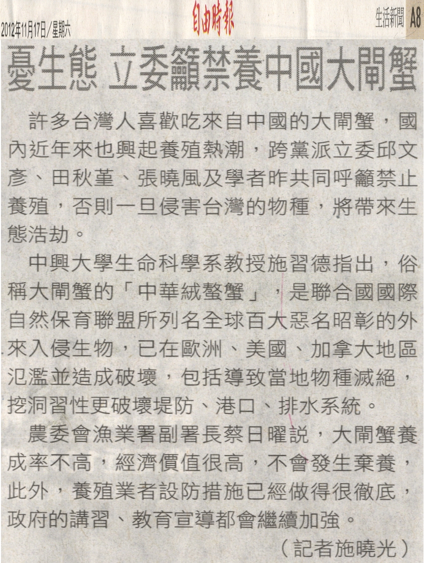 許多台灣人喜歡吃來自中國的大閘蟹,國內近年來也興起養殖熱潮,跨黨派立委邱文彥、田秋堇、張曉風及學者昨共同呼籲禁止養殖,否則一旦侵害台灣的物種,將帶來生態浩劫。