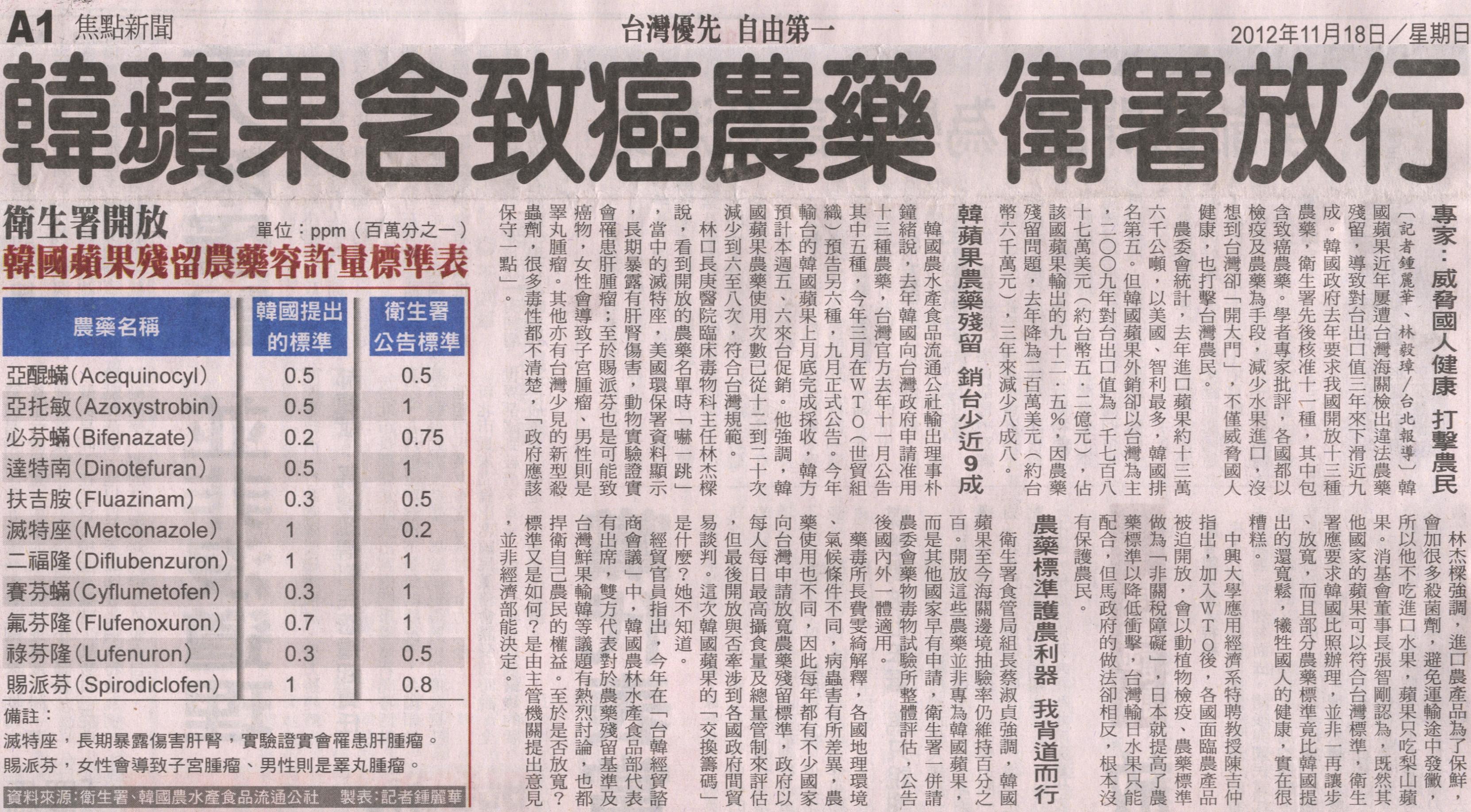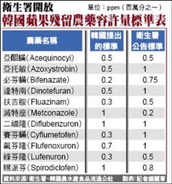韓國農水產食品流通公社輸出理事朴鐘緒說,去年韓國向台灣政府申請准用十三種農藥,台灣官方去年十一月公告其中五種,今年三月在WTO(世貿組織)預告另六種,九月正式公告。今年輸台的韓國蘋果上月底完成採收,韓方預計本週五、六來台促銷。他強調,韓國蘋果農藥使用次數已從十二到二十次減少到六至八次,符合台灣規範。