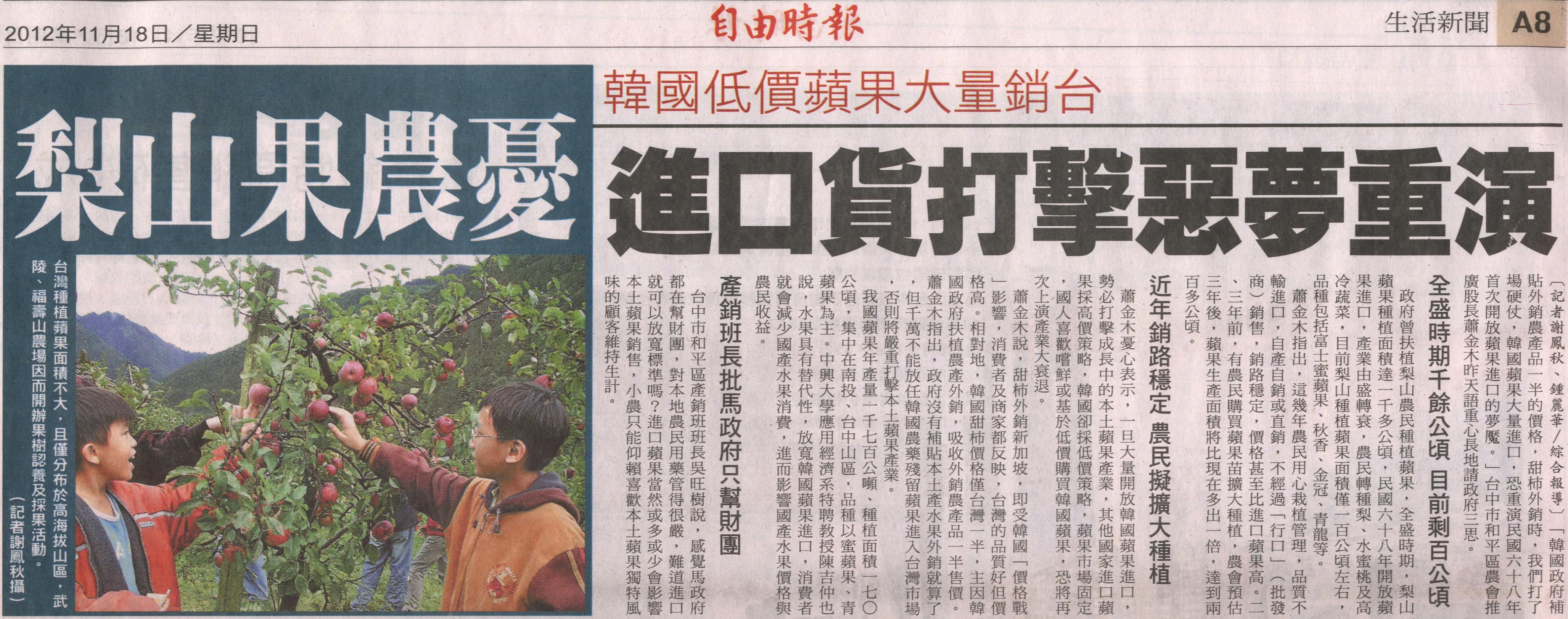 我國蘋果年產量一千七百公噸、種植面積一七○公頃,集中在南投、台中山區,品種以蜜蘋果、青蘋果為主。中興大學應用經濟系特聘教授陳吉仲也說,水果具有替代性,放寬韓國蘋果進口,消費者就會減少國產水果消費,進而影響國產水果價格與農民收益。