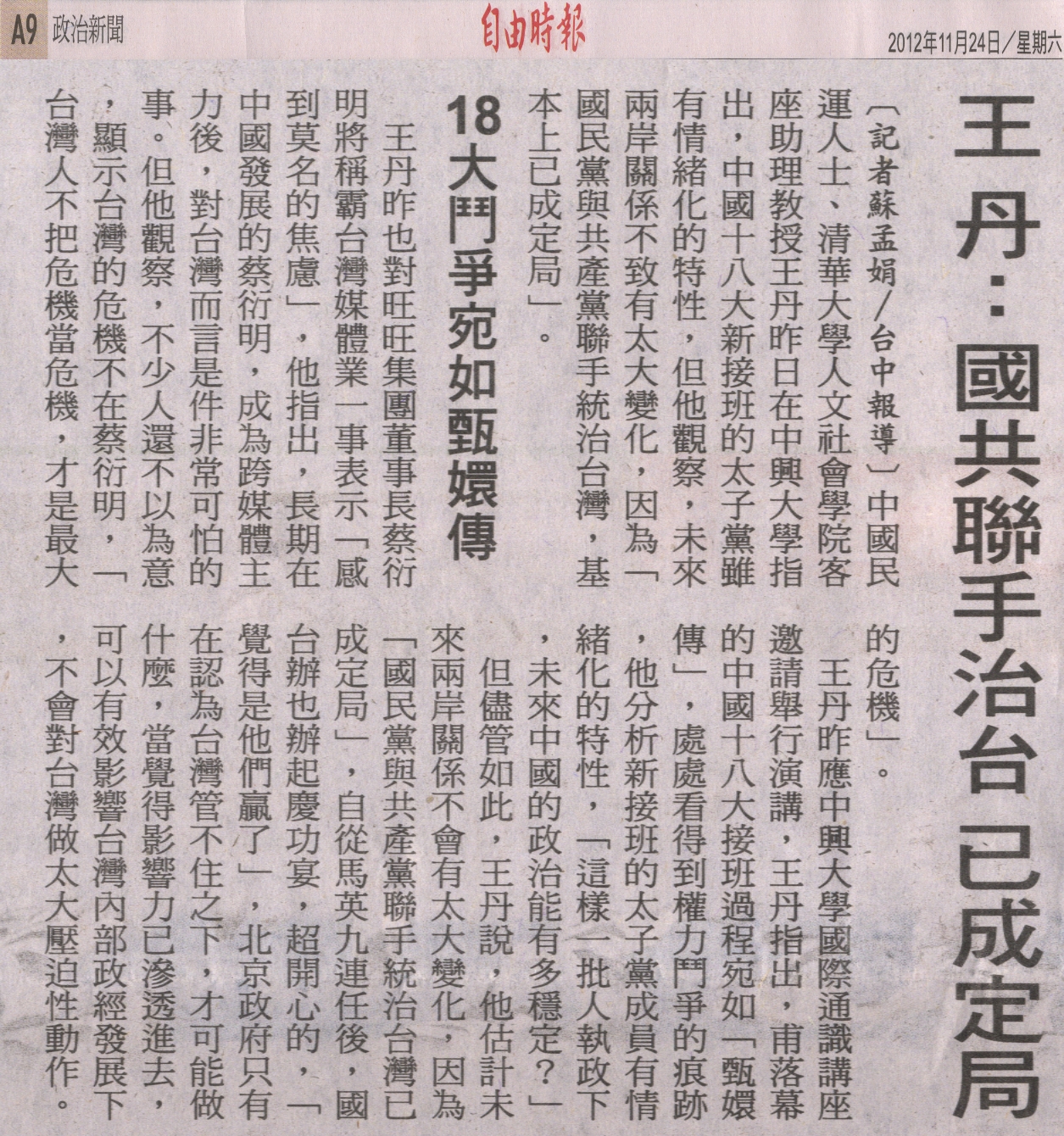 中國民運人士、清華大學人文社會學院客座助理教授王丹昨日在中興大學指出,中國十八大新接班的太子黨雖有情緒化的特性,但他觀察,未來兩岸關係不致有太大變化,因為「國民黨與共產黨聯手統治台灣,基本上已成定局」。