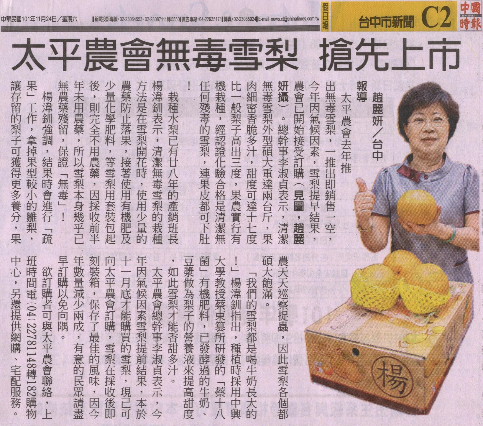 太平農會總幹事李淑貞表示,今年因氣候因素雪梨提前結果,本於十一月底才能購買的雪梨,現已可向太平農會訂購,雪梨在採收後即刻裝箱,保存了最佳的風味,因今年數量減少兩成,有意的民眾請盡早訂購以免向隅。