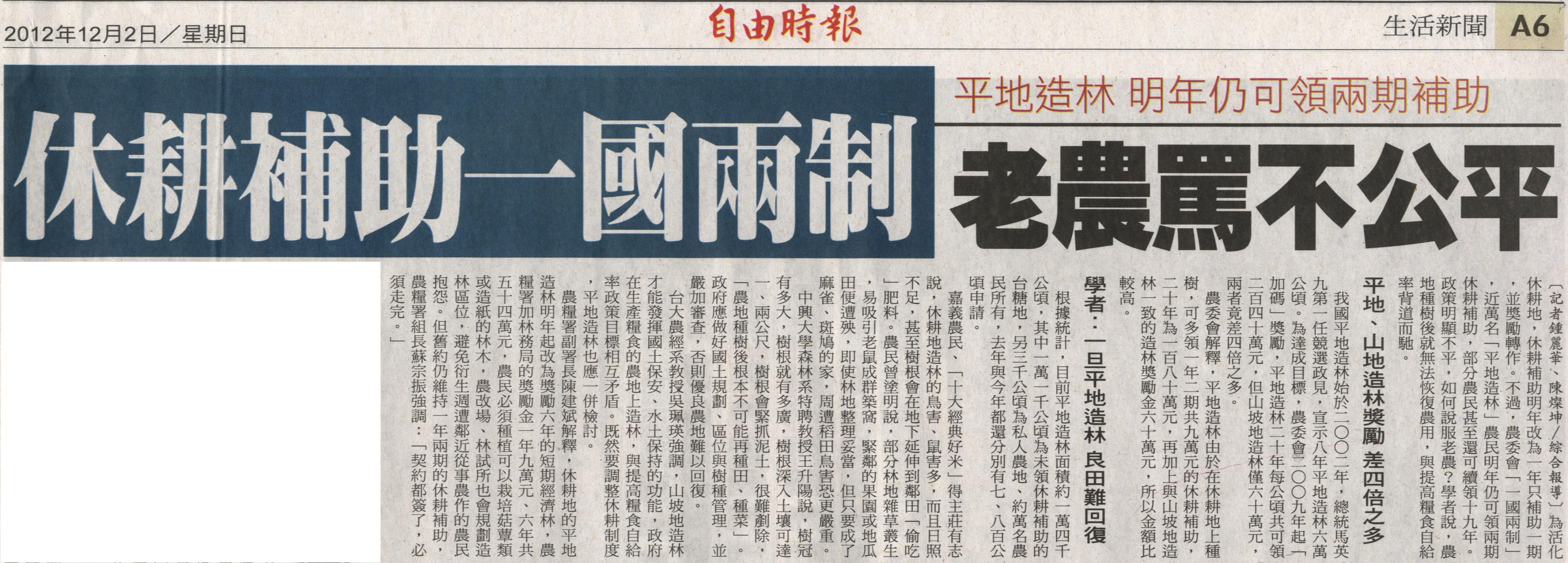 為活化休耕地,休耕補助明年改為一年只補助一期,並獎勵轉作。不過,農委會「一國兩制」,近萬名「平地造林」農民明年仍可領兩期休耕補助,部分農民甚至還可續領十九年。政策明顯不平,如何說服老農?學者說,農地種樹後就無法恢復農用,與提高糧食自給率背道而馳。