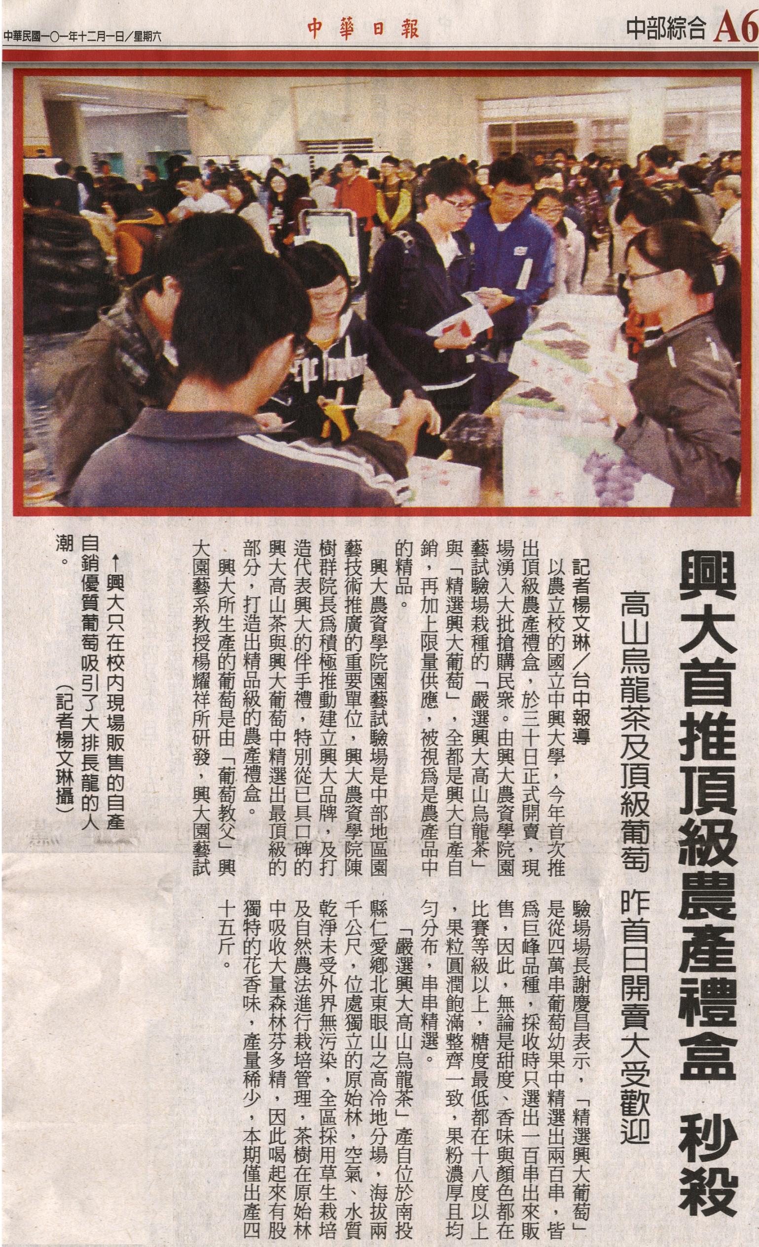 以農立校的國立中興大學,今年首次推出頂級農產禮盒,於三十日正式開賣,現場湧入大批搶購民眾。由興大農資學院園藝試驗場栽種的「嚴選興大高山烏龍茶」與「精選興大葡萄」,全都是興大自產自銷,再加上限量供應,被視為是農產品中的精品。