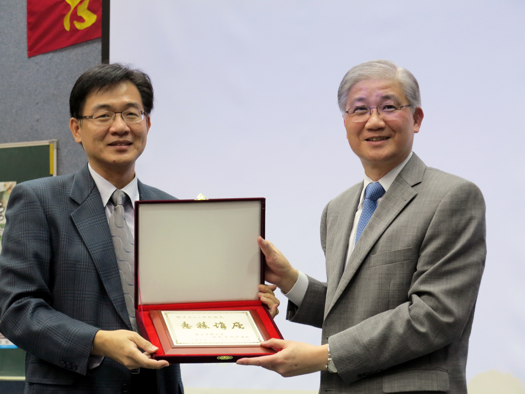 演講會場吸引大批師生到場聆聽 中興大學生科學院陳鴻震院長(左)頒贈「惠蓀講座」獎牌給楊泮池院長 |