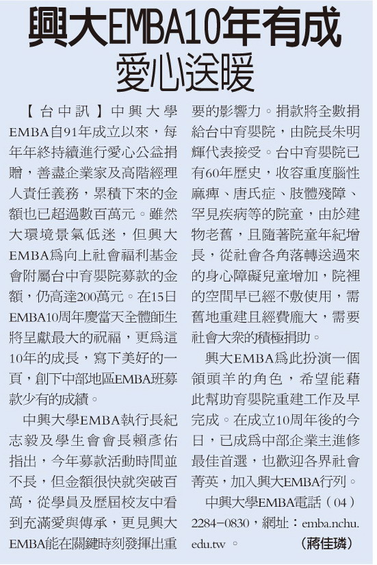 中興大學EMBA自91年成立以來,每年年終持續進行愛心公益捐贈,善盡企業家及高階經理人責任義務,累積下來的金額也已超過數百萬元。雖然大環境景氣低迷,但興大EMBA為向上社會福利基金會附屬台中育嬰院募款的金額,仍高達200萬元。在15日EMBA10周年慶當天全體師生將呈獻最大的祝福,更為這10年的成長,寫下美好的一頁,創下中部地區EMBA班募款少有的成績。