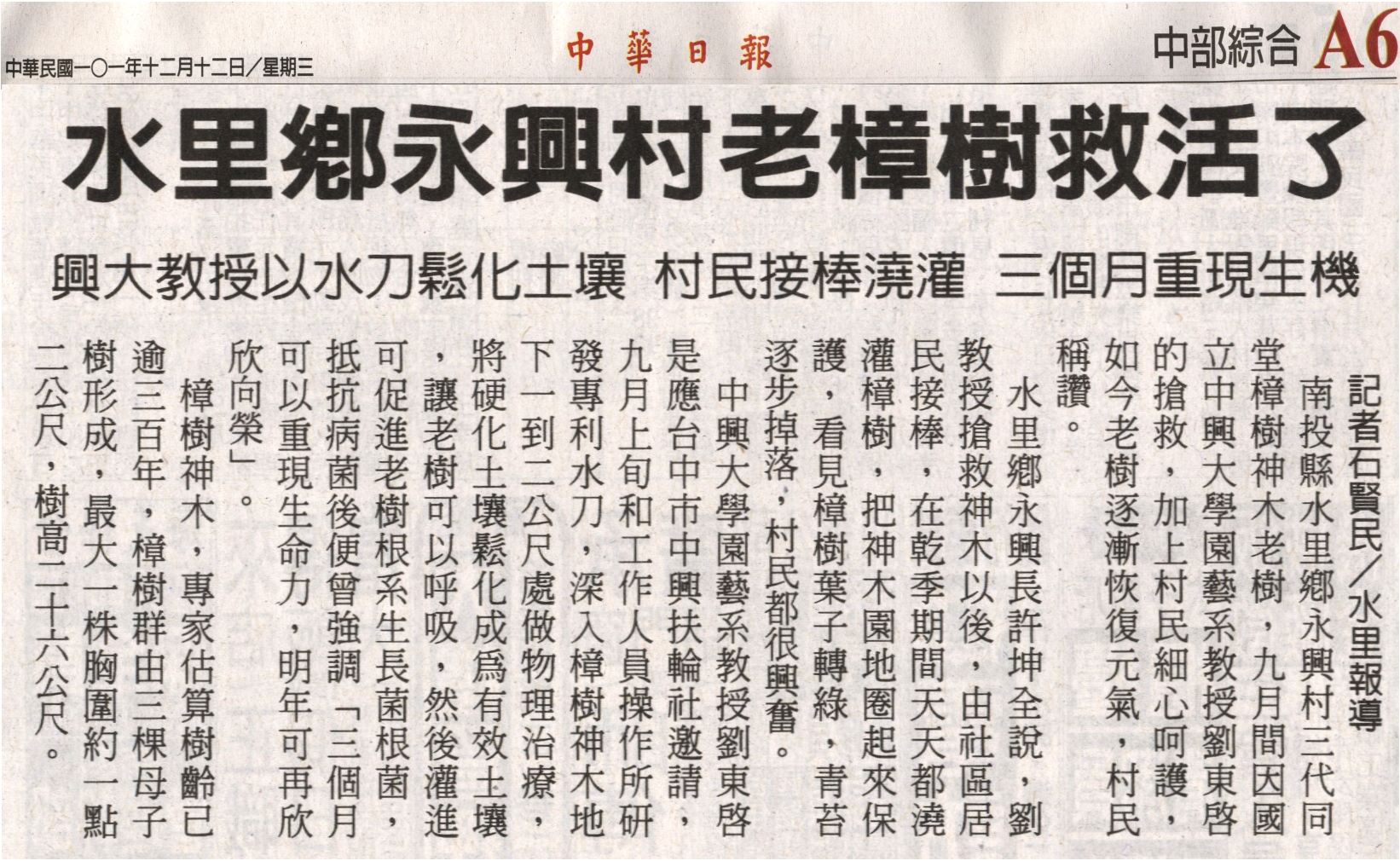 中興大學園藝系教授劉東啟是應台中市中興扶輪社邀請,九月上旬和工作人員操作所研發專利水刀,深入樟樹神木地下一到二公尺處做物理治療,將硬化土壤鬆化成為有效土壤,讓老樹可以呼吸,然後灌進可促進老樹根系生長菌根菌,抵抗病菌後便曾強調「三個月可以重現生命力,明年可再欣欣向榮」。