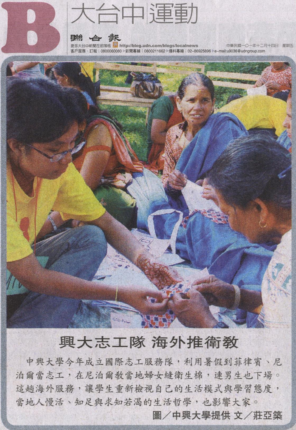 中興大學今年成立國際志工服務隊,利用暑假到菲律賓、尼泊爾當志工,在尼泊爾教當地婦女縫衛生棉,連男生也下場。這趟海外服務,讓學生重新檢視自己的生活模式與學習態度,當地人慢活、知足與求知若渴的生活哲學,也影響大家。