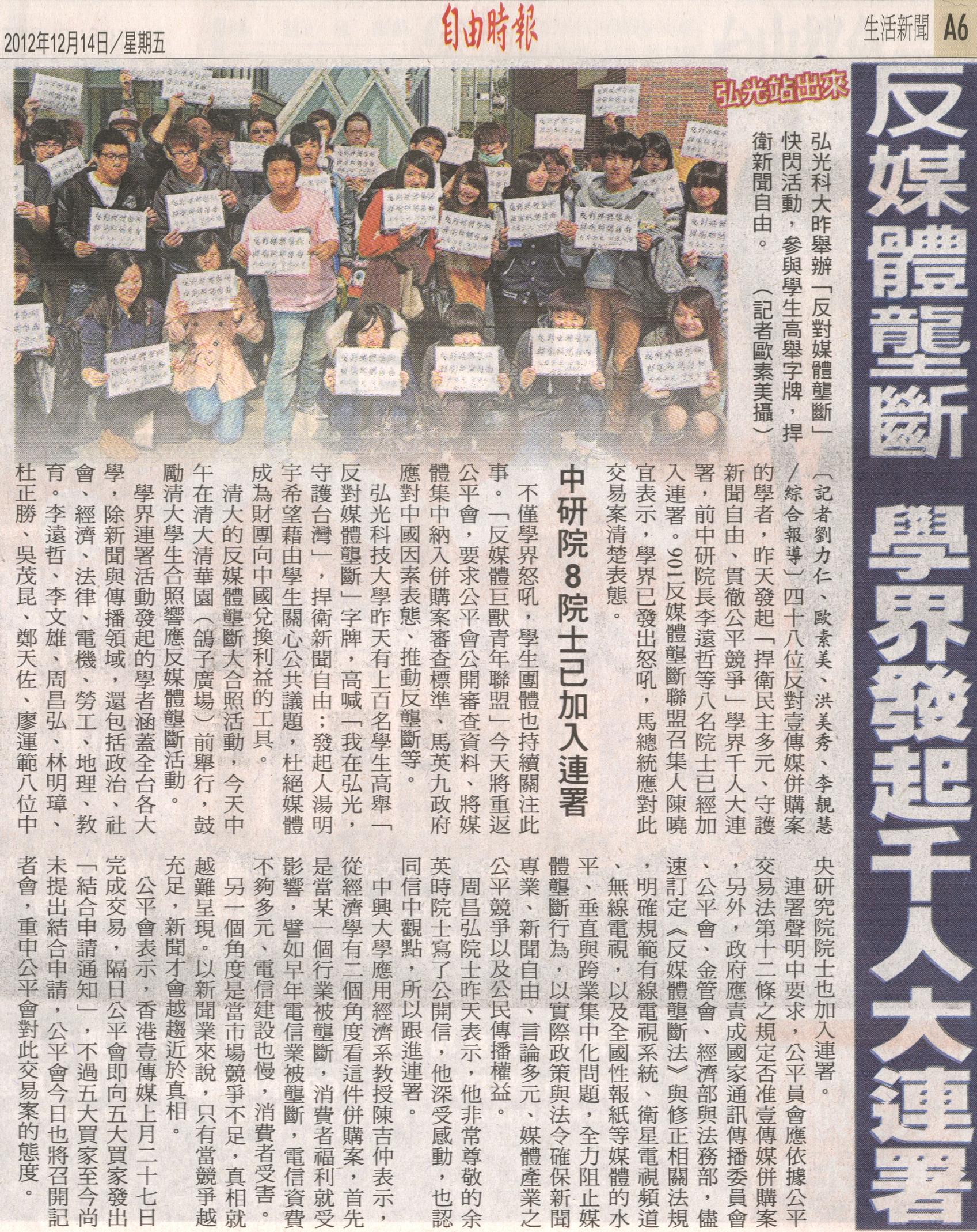 弘光科技大學昨天有上百名學生高舉「反對媒體壟斷」字牌,高喊「我在弘光,守護台灣」,捍衛新聞自由;發起人湯明宇希望藉由學生關心公共議題,杜絕媒體成為財團向中國兌換利益的工具。