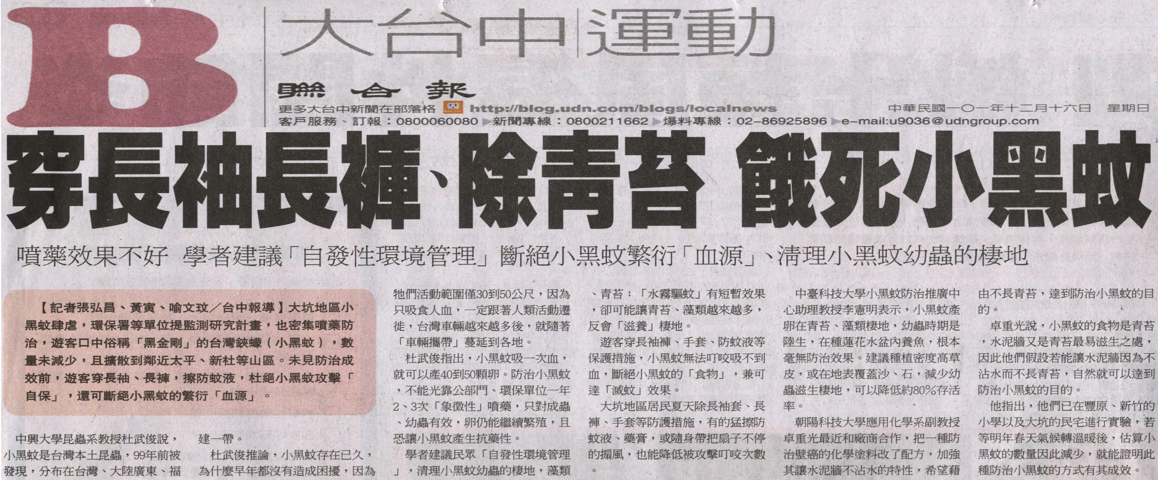 他指出,他們已在豐原、新竹的小學以及大坑的民宅進行實驗,若等明年春天氣候轉溫暖後,估算小黑蚊的數量因此減少,就能證明此種防治小黑蚊的方式有其成效。