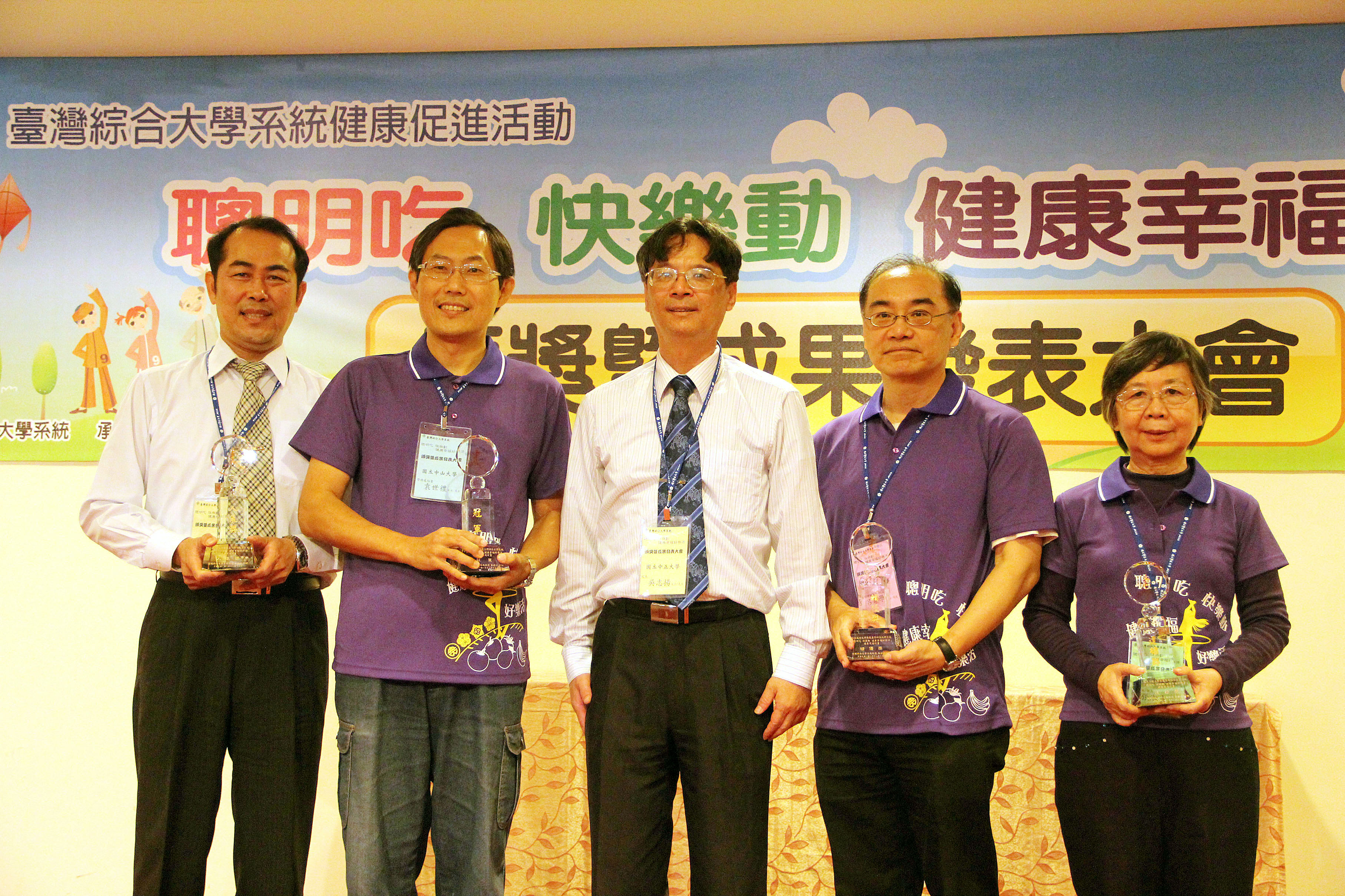 ![]() 台綜大四校師長代表上台授獎,並由中正大學校長(中)頒獎。中興大學保健組組長張淑良代表校方受贈「達標獎」(右一)、成功大學衛保組組長呂宗學代表校方受贈「績優獎」(右二)、中山大學學務處秘書袁世禮代表校方受贈「冠軍獎」(左二)、中正大學學務長楊士隆代表校方受贈「人氣獎」(左一)。 台綜大四校減重第一名團隊代表上台領獎,開心不已。 ![]() 四校師生合影。 |