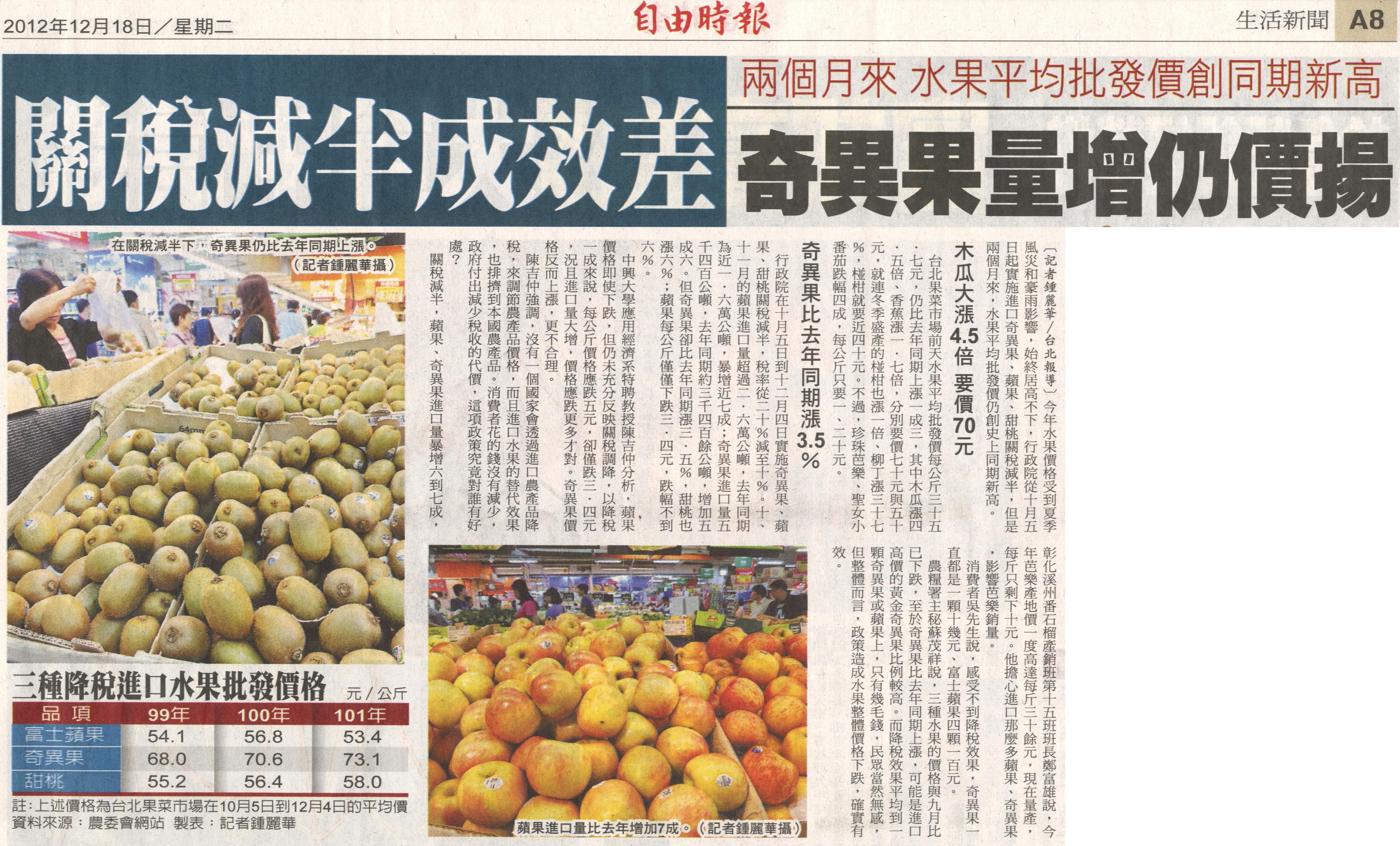 行政院在十月五日到十二月四日實施奇異果、蘋果、甜桃關稅減半,稅率從二十%減至十%。十、十一月的蘋果進口量超過二.六萬公噸,去年同期為近一.六萬公噸,暴增近七成;奇異果進口量五千四百公噸,去年同期約三千四百餘公噸,增加五成六。但奇異果卻比去年同期漲三.五%,甜桃也漲六%;蘋果每公斤僅僅下跌三.四元,跌幅不到六%。