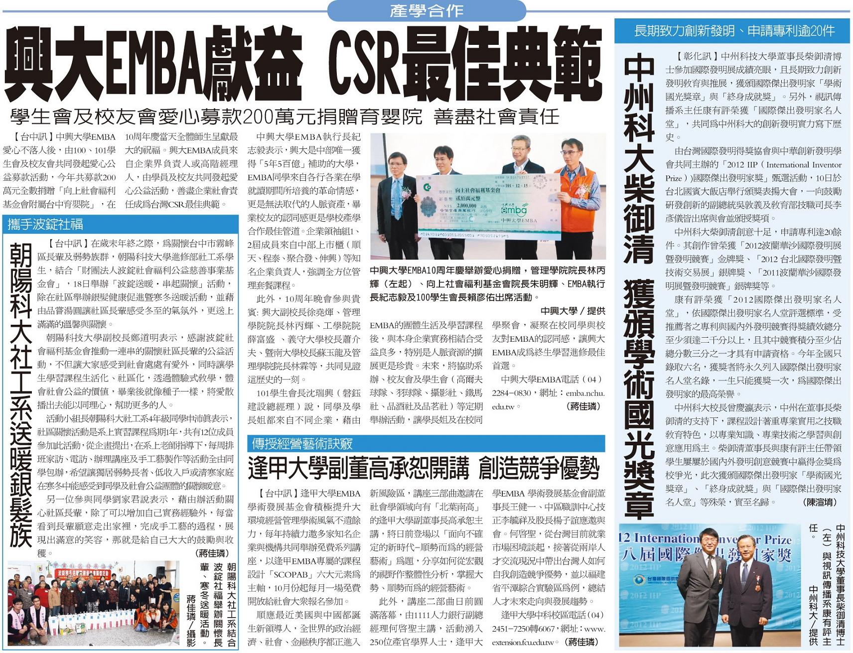 中興大學EMBA愛心不落人後,由100、101學生會及校友會共同發起愛心公益募款活動,今年共募款200萬元全數捐贈「向上社會福利基金會附屬台中育嬰院」,在10周年慶當天全體師生呈獻最大的祝福。興大EMBA成員來自企業界負責人或高階經理人,由學員及校友共同發起愛心公益活動,善盡企業社會責任成為台灣CSR最佳典範。