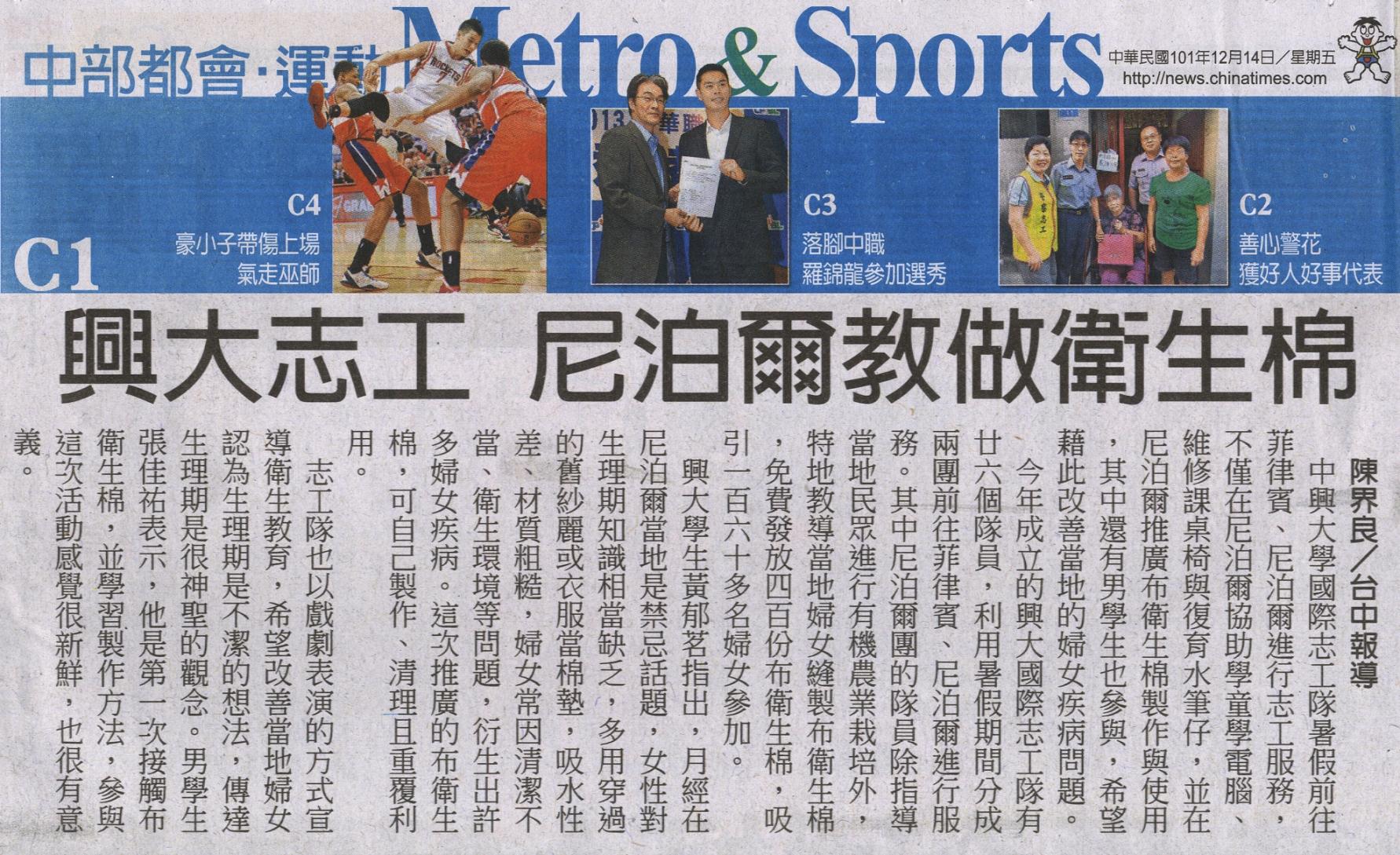 今年成立的興大國際志工隊有廿六個隊員,利用暑假期間分成兩團前往菲律賓、尼泊爾進行服務。其中尼泊爾團的隊員除指導當地民眾進行有機農業栽培外,特地教導當地婦女縫製布衛生棉,免費發放四百份布衛生棉,吸引一百六十多名婦女參加。
