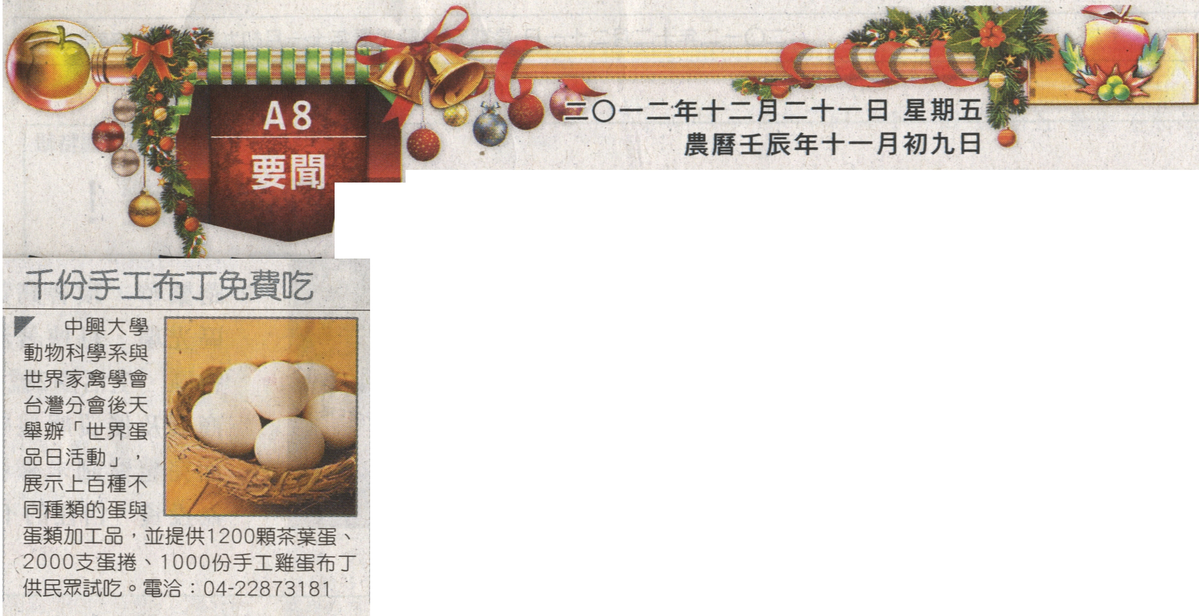 中興大學動物科學系與世界家禽學會台灣分會後天舉辦「世界蛋品日活動」,展示上百種不同種類的蛋與蛋類加工品,並提供1200顆茶葉蛋、2000支蛋捲、1000份手工雞蛋布丁供民眾試吃。電洽:04-22873181