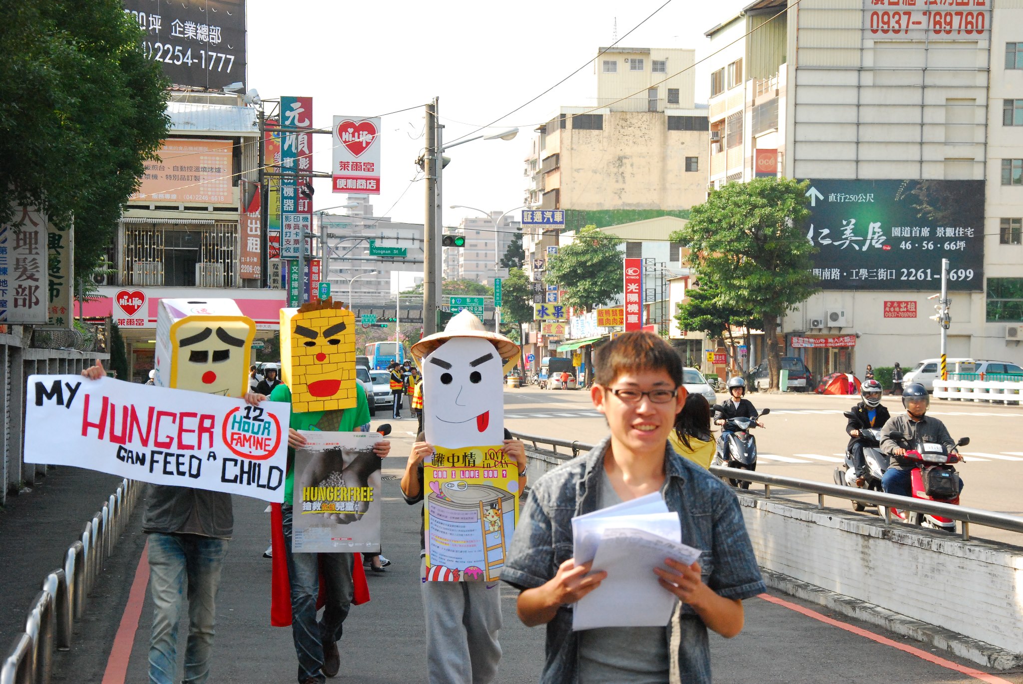 ![]() 上百位興大學生共同參與「飢餓十二」活動 體驗飢餓 ![]() 中興大學學生選擇用飢餓來度過末日 ![]() 活動前的街頭宣傳。(取自興大「飢餓十二」臉書相簿) |