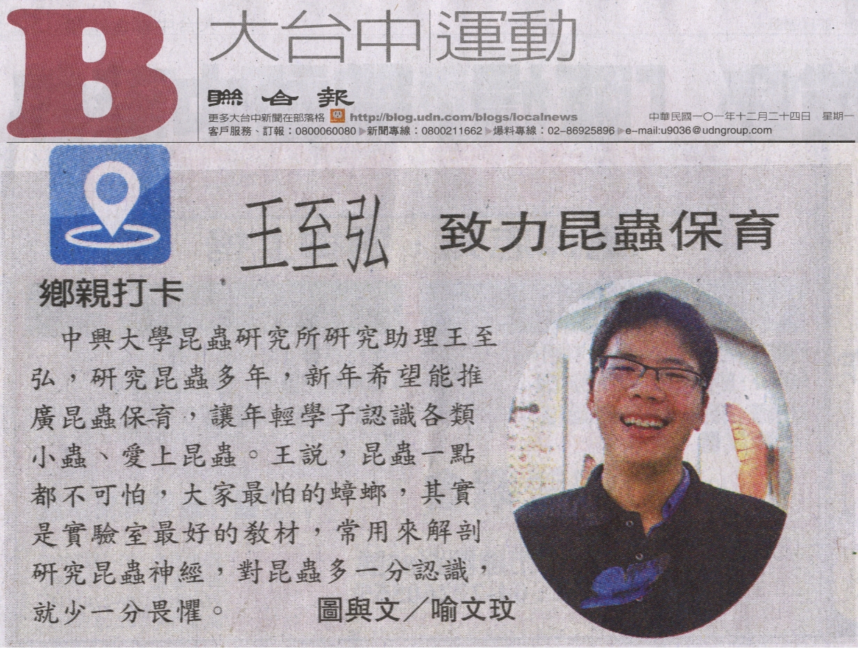 中興大學昆蟲研究所研究助理王至弘,研究昆蟲多年,新年希望能推廣昆蟲保育,讓年輕學子認識各類小蟲、愛上昆蟲。王說,昆蟲一點都不可怕,大家最怕的蟑螂,其實是實驗室最好的教材,常用來解剖研究昆蟲神經,對昆蟲多一分認識,就少一分畏懼。