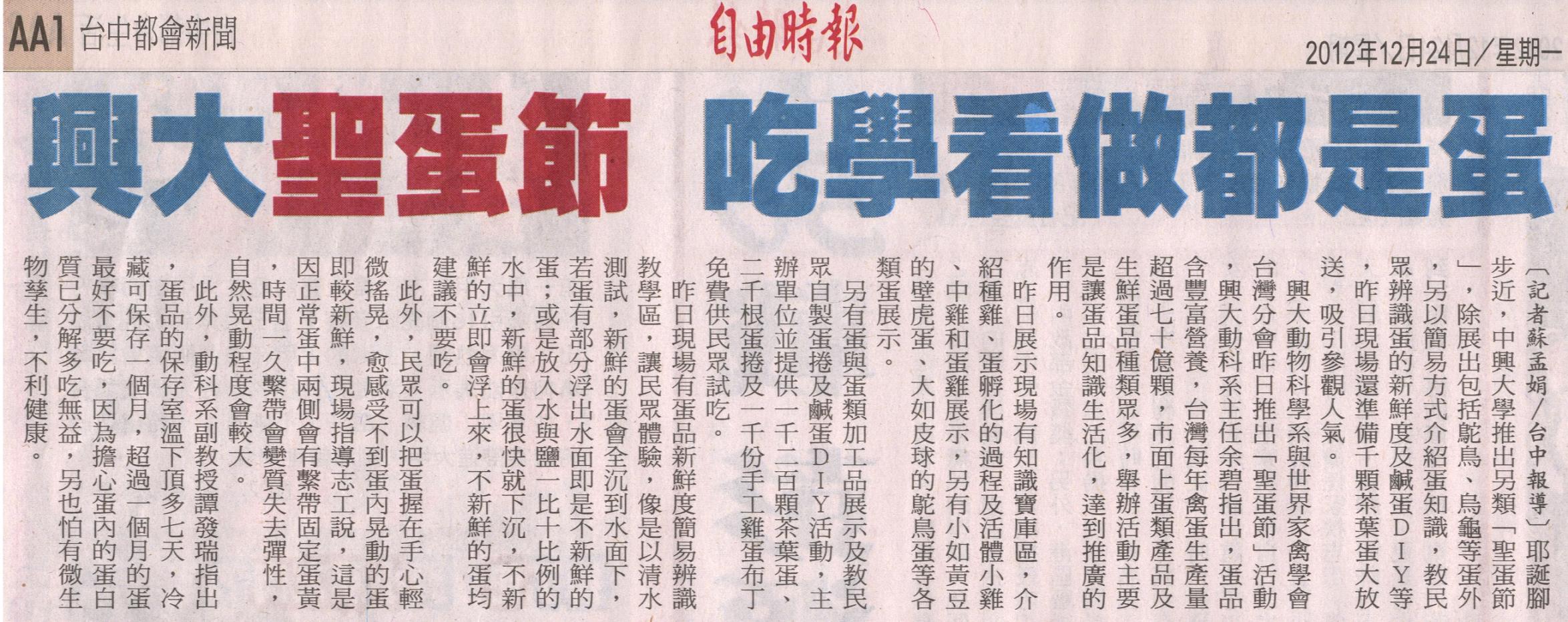 興大動物科學系與世界家禽學會台灣分會昨日推出「聖蛋節」活動,興大動科系主任余碧指出,蛋品含豐富營養,台灣每年禽蛋生產量超過七十億顆,市面上蛋類產品及生鮮蛋品種類眾多,舉辦活動主要是讓蛋品知識生活化,達到推廣的作用。