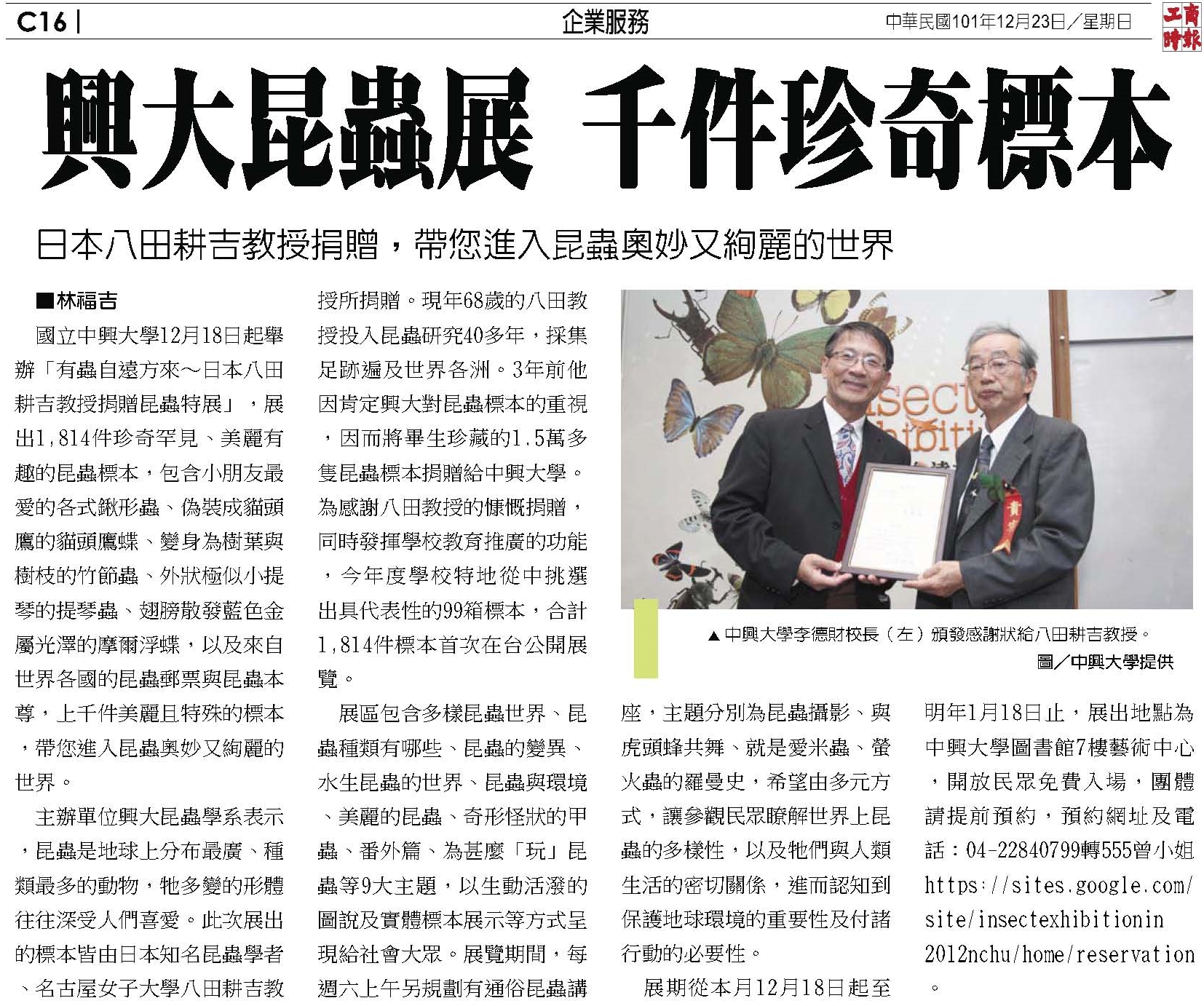 國立中興大學12月18日起舉辦「有蟲自遠方來~日本八田耕吉教授捐贈昆蟲特展」,展出1,814件珍奇罕見、美麗有趣的昆蟲標本,包含小朋友最愛的各式鍬形蟲、偽裝成貓頭鷹的貓頭鷹蝶、變身為樹葉與樹枝的竹節蟲、外狀極似小提琴的提琴蟲、翅膀散發藍色金屬光澤的摩爾浮蝶,以及來自世界各國的昆蟲郵票與昆蟲本尊,上千件美麗且特殊的標本,帶您進入昆蟲奧妙又絢麗的世界。