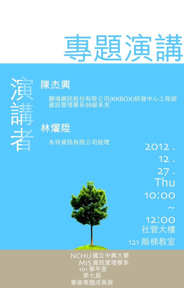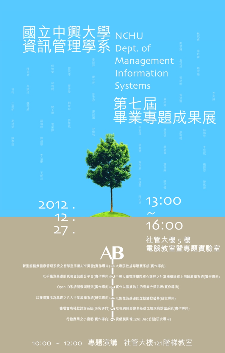 本系謹訂於101年12月27日(星期四)舉辦101學年度「第七屆中興大學資訊管理實務專題成果展」。