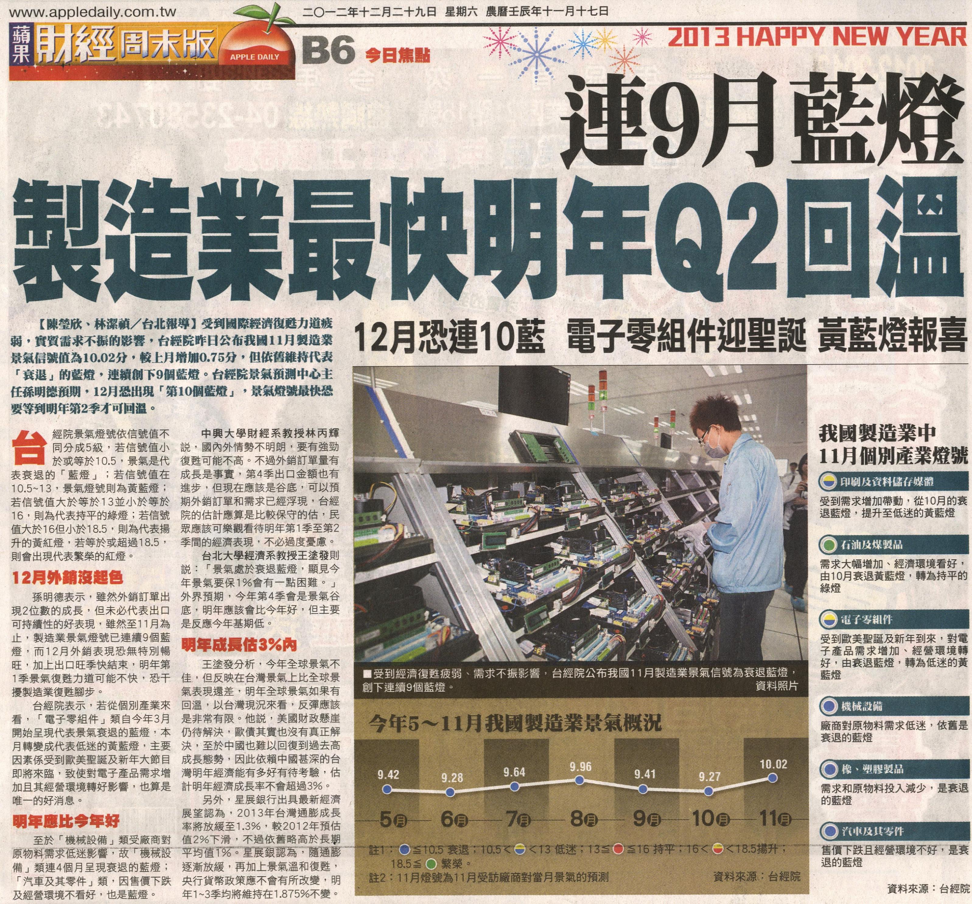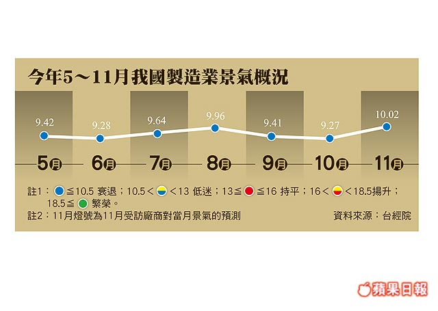 國受到國際經濟復甦力道疲弱,實質需求不振的影響,台經院昨日公布我國11月製造業景氣信號值為10.02分,較上月增加0.75分,但依舊維持代表「衰退」的藍燈,連續創下9個藍燈。台經院景氣預測中心主任孫明德預期,12月恐出現「第10個藍燈」,景氣燈號最快恐要等到明年第2季才可回溫。