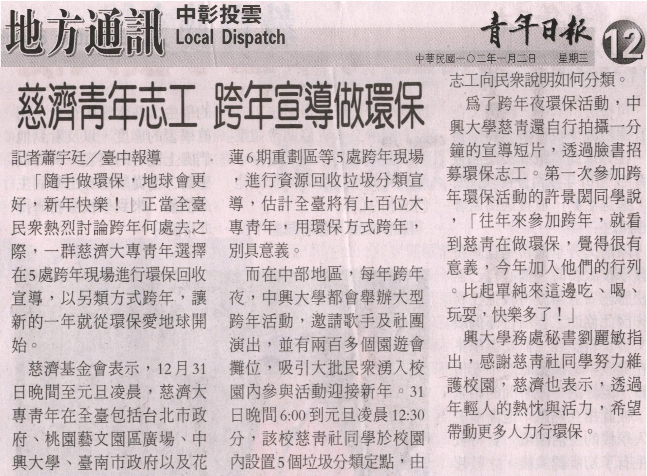 慈濟基金會表示,12月31日晚間至元旦凌晨,慈濟大專青年在全臺包括台北市政府、桃園藝文園區廣場、中興大學、臺南市政府以及花蓮6期重劃區等5處跨年現場,進行資源回收垃圾分類宣導,估計全臺將有上百位大專青年,用環保方式跨年,別具意義。