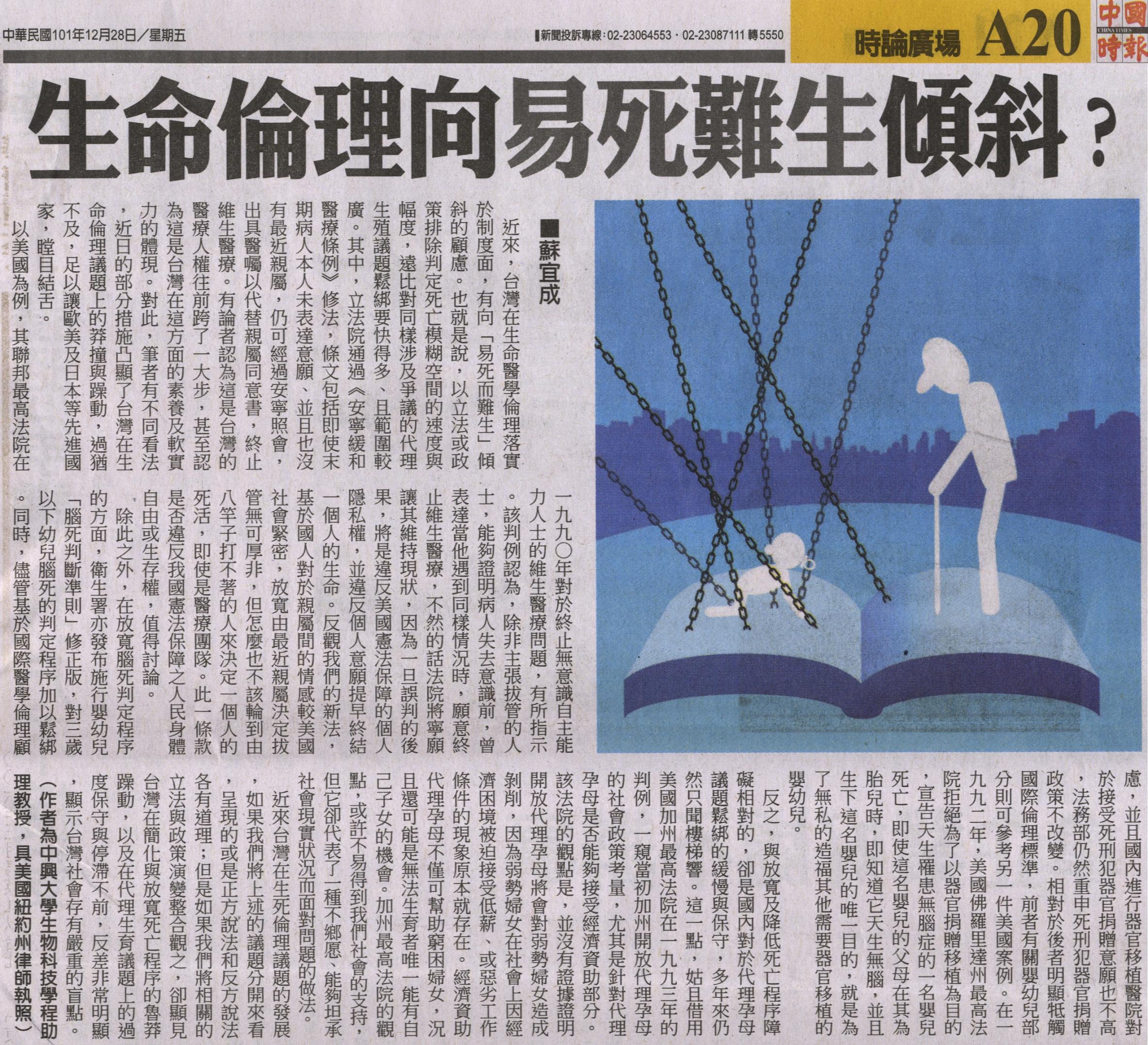 近來,台灣在生命醫學倫理落實於制度面,有向「易死而難生」傾斜的顧慮。也就是說,以立法或政策排除判定死亡模糊空間的速度與幅度,遠比對同樣涉及爭議的代理生殖議題鬆綁要快得多、且範圍較廣。其中,立法院通過《安寧緩和醫療條例》修法,條文包括即使末期病人本人未表達意願、並且也沒有最近親屬,仍可經過安寧照會,出具醫囑以代替親屬同意書,終止維生醫療。有論者認為這是台灣的醫療人權往前跨了一大步,甚至認為這是台灣在這方面的素養及軟實力的體現。對此,筆者有不同看法,近日的部分措施凸顯了台灣在生命倫理議題上的莽撞與躁動,過猶不及,足以讓歐美及日本等先進國家,瞠目結舌。