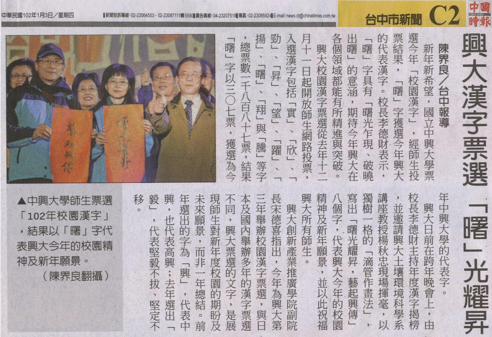 興大校園漢字票選從去年十二月十一日起開放師生網路投票,入選漢字包括「實」、「欣」、「勁」、「昇」、「望」、「躍」、「揚」、「曙」、「翔」與「騰」等字,總票數一千八百八十七票,結果「曙」字以三○七票,獲選為今年中興大學的代表字。