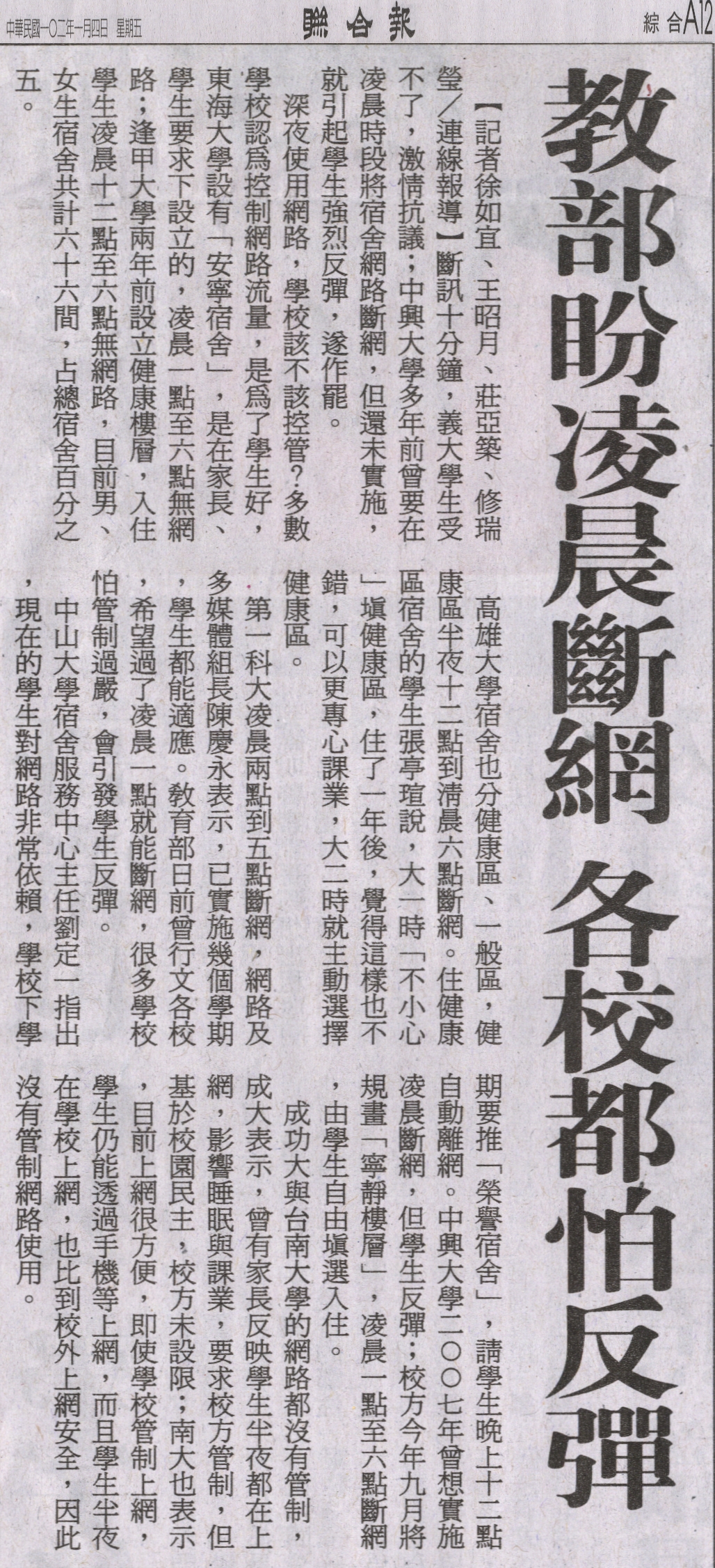中山大學宿舍服務中心主任劉定一指出,現在的學生對網路非常依賴,學校下學期要推「榮譽宿舍」,請學生晚上十二點自動離網。中興大學二○○七年曾想實施凌晨斷網,但學生反彈;校方今年九月將規畫「寧靜樓層」,凌晨一點至六點斷網,由學生自由填選入住。