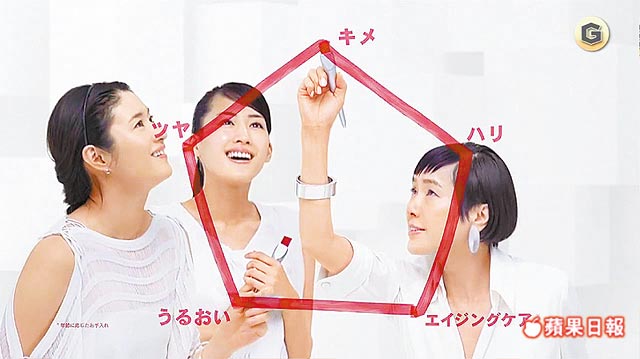日本女星(左起)小雪、綾瀨遙、桃井薰同拍SK-II廣告,卻被網友抓包五角形畫線情節不合理。 |