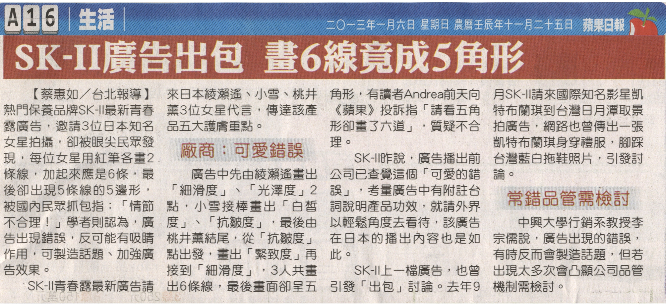 熱門保養品牌SK-II最新青春露廣告,邀請3位日本知名女星拍攝,卻被眼尖民眾發現,每位女星用紅筆各畫2條線,加起來應是6條,最後卻出現5條線的5邊形,被國內民眾抓包指:「情節不合理!」學者則認為,廣告出現錯誤,反可能有吸睛作用,可製造話題、加強廣告效果。