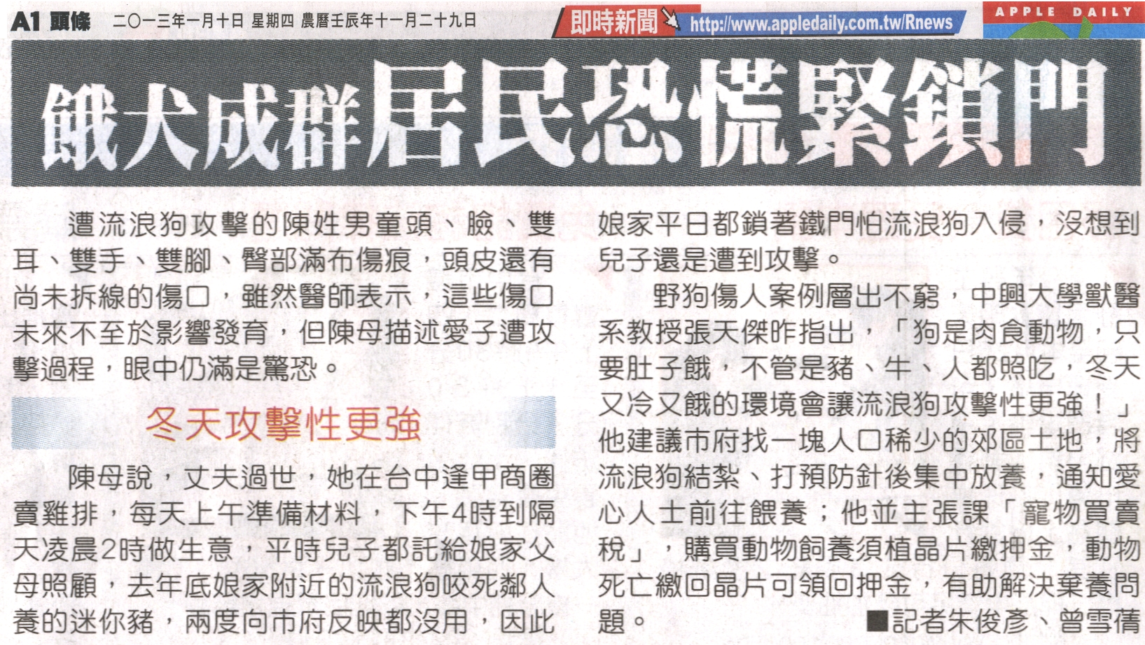 野狗傷人案例層出不窮,中興大學獸醫系教授張天傑昨指出,「狗是肉食動物,只要肚子餓,不管是豬、牛、人都照吃,冬天又冷又餓的環境會讓流浪狗攻擊性更強!」他建議市府找一塊人口稀少的郊區土地,將流浪狗結紮、打預防針後集中放養,通知愛心人士前往餵養;他並主張課「寵物買賣稅」,購買動物飼養須植晶片繳押金,動物死亡繳回晶片可領回押金,有助解決棄養問題。