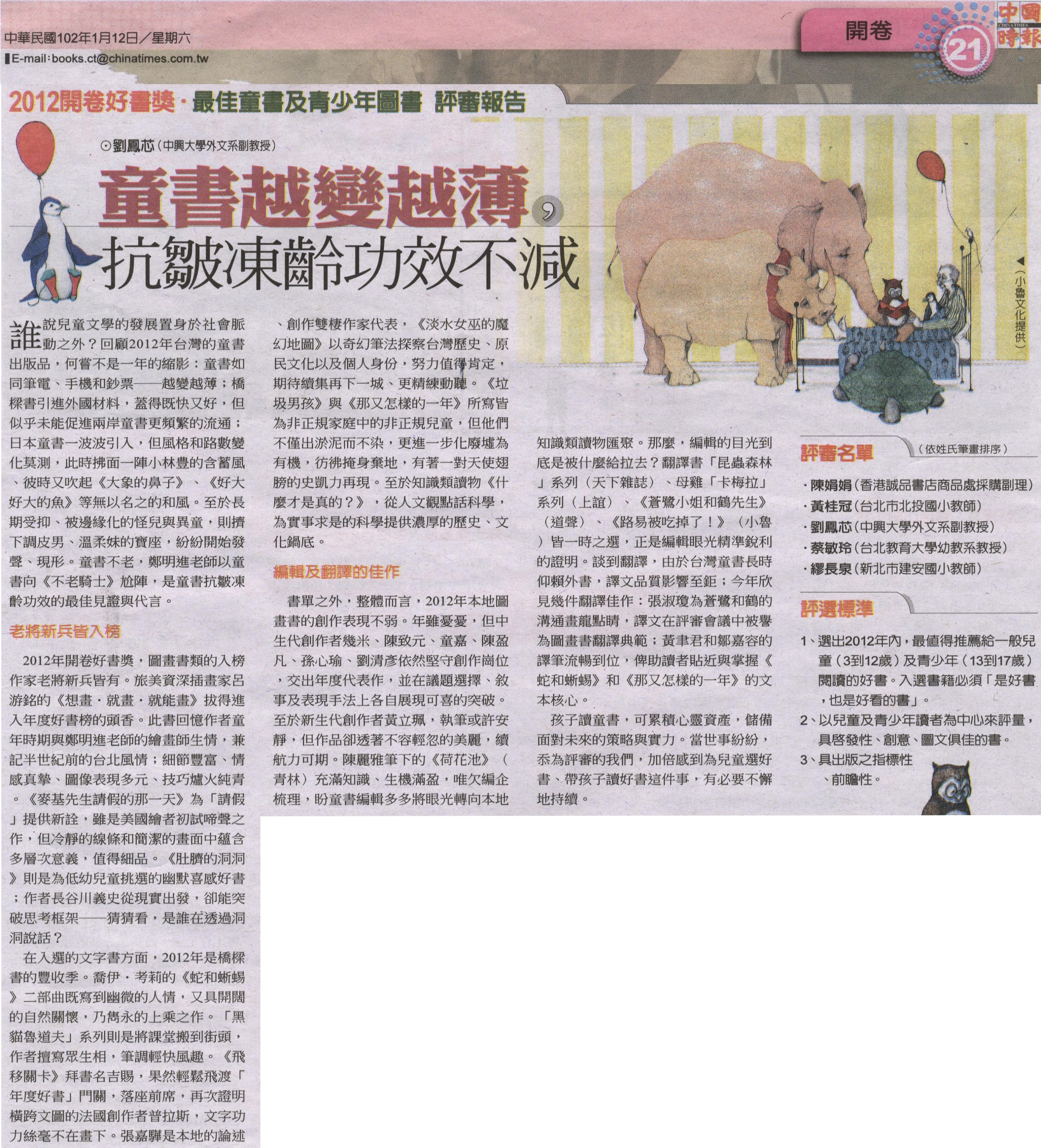 誰說兒童文學的發展置身於社會脈動之外?回顧2012年台灣的童書 出版品,何嘗不是一年的縮影:童書如同筆電、手機和鈔票──越變 越薄;橋樑書引進外國材料,蓋得既快又好,但似乎未能促進兩岸童 書更頻繁的流通;日本童書一波波引入,但風格和路數變化莫測,此 時拂面一陣小林豊的含蓄風、彼時又吹起《大象的鼻子》、《好大好 大的魚》等無以名之的和風。至於長期受抑、被邊緣化的怪兒與異童 ,則擠下調皮男、溫柔妹的寶座,紛紛開始發聲、現形。童書不老, 鄭明進老師以童書向《不老騎士》尬陣,是童書抗皺凍齡功效的最佳 見證與代言。