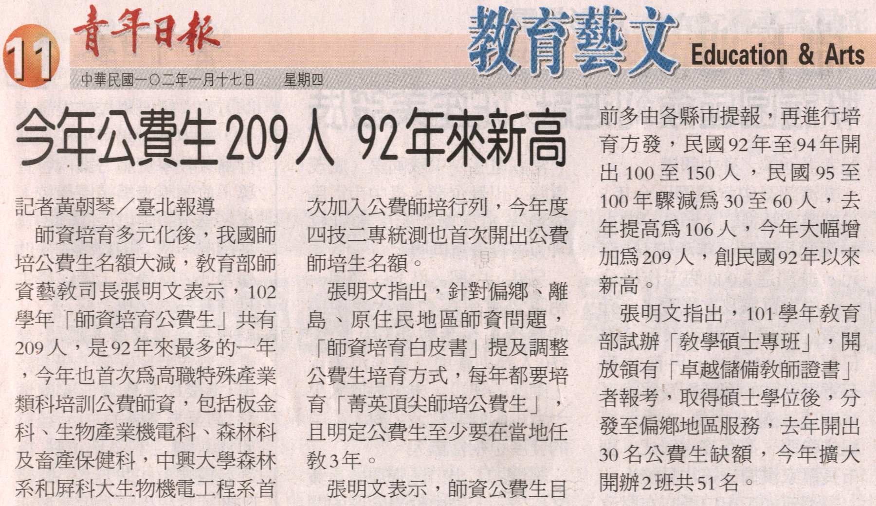 師資培育多元化後,我國師培公費生名額大減,教育部師資藝教司長張明文表示,102學年「師資培育公費生」共有209人,是92年來最多的一年,今年也首次為高職特殊產業類科培訓公費師資,包括板金科、生物產業機電科、森林科及畜產保健科,中興大學森林系和屏科大生物機電工程系首次加入公費師培行列,今年度四技二專統測也首次開出公費師培生名額。